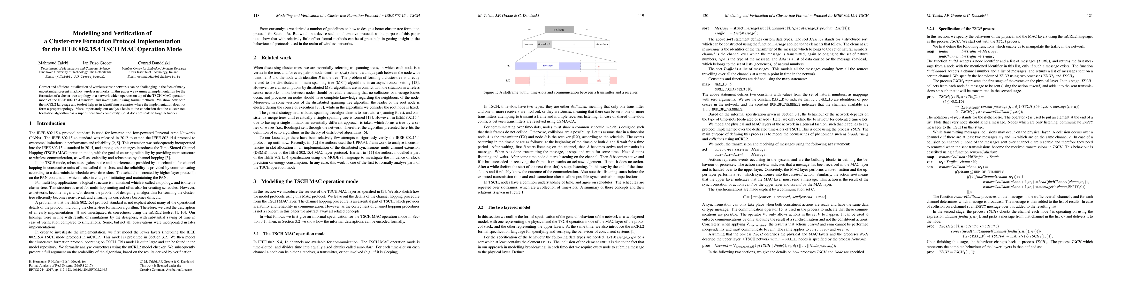 Correct and efficient initialization of wireless sensor networks can be challenging in the face of many uncertainties present in ad hoc wireless networks. In this paper we examine an implementation for the formation of a cluster-tree topology in a network which operates on top of the TSCH MAC operation mode of the IEEE 802.15.4 standard, and investigate it using formal methods. We show how both the mCRL2 language and toolset help us in identifying scenarios where the implementation does not form a proper topology. More importantly, our analysis leads to the conclusion that the cluster-tree formation algorithm has a super linear time complexity. So, it does not scale to large networks.