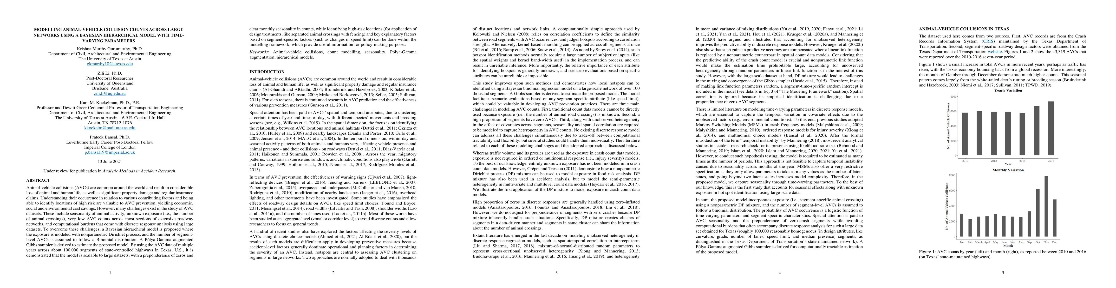 Animal-vehicle collisions (AVCs) are common around the world and result in considerable loss of animal and human life, as well as significant property damage and regular insurance claims. Understanding their occurrence in relation to various contributing factors and being able to identify locations of high risk are valuable to AVC prevention, yielding economic, social and environmental cost savings. However, many challenges exist in the study of AVC datasets. These include seasonality of animal activity, unknown exposure (i.e., the number of animal crossings), very low AVC counts across most sections of extensive roadway networks, and computational burdens that come with discrete response analysis using large datasets. To overcome these challenges, a Bayesian hierarchical model is proposed where the exposure is modeled with nonparametric Dirichlet process, and the number of segment-level AVCs is assumed to follow a Binomial distribution. A P\'olya-Gamma augmented Gibbs sampler is derived to estimate the proposed model. By using the AVC data of multiple years across about 100,000 segments of state-controlled highways in Texas, U.S., it is demonstrated that the model is scalable to large datasets, with a preponderance of zeros and clear monthly seasonality in counts, while identifying high-risk locations (for application of design treatments, like separated animal crossings with fencing) and key explanatory factors based on segment-specific factors (such as changes in speed limit) can be done within the modelling framework, which provide useful information for policy-making purposes.
