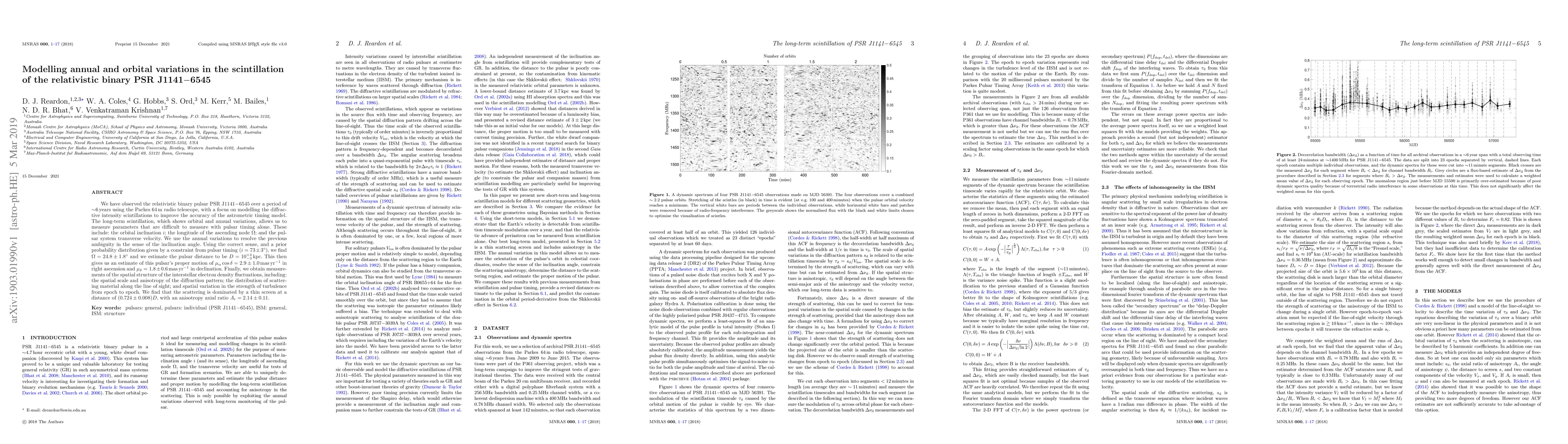 The study observed PSR J1141$-$6545 over 6 years, modeling diffractive scintillations to enhance pulsar timing accuracy. Key findings include measuring orbital inclination ($i=73pm3^circ$), longitude of ascending node ($Omega=24.8pm1.8^circ$), and pulsar distance ($D=10^{+4}_{-3}$ kpc). The research also estimated the pulsar's proper motion and detailed interstellar electron density fluctuations, identifying a thin scattering screen at $(0.724pm0.008)D$ with axial ratio $A_{ m r} = 2.14pm0.11$.