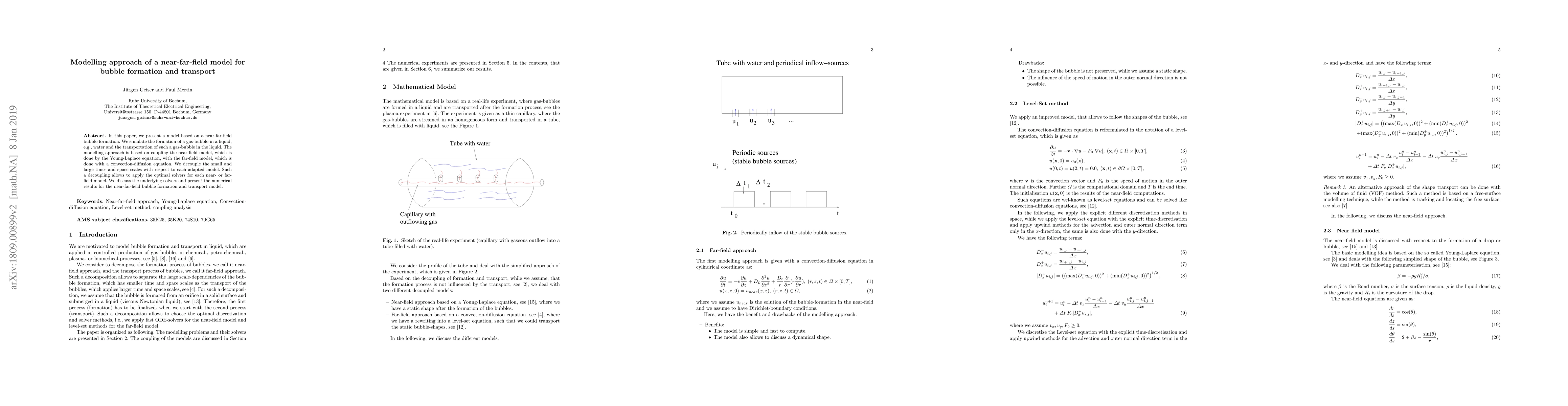 In this paper, we present a model based on a near-far-field bubble formation. We simulate the formation of a gas-bubble in a liquid, e.g., water and the transportation of such a gas-bubble in the liquid. The modelling approach is based on coupling the near-field model, which is done by the Young-Laplace equation, with the far-field model, which is done with a convection-diffusion equation. We decouple the small and large time- and space scales with respect to each adapted model. Such a decoupling allows to apply the optimal solvers for each near- or far-field model. We discuss the underlying solvers and present the numerical results for the near-far-field bubble formation and transport model.