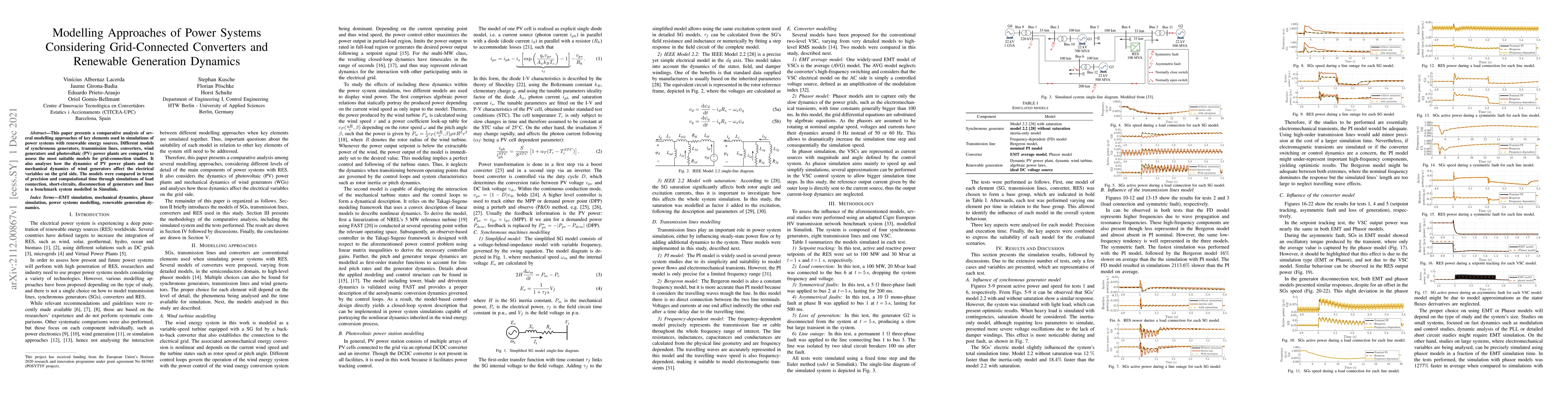 This paper presents a comparative analysis of several modelling approaches of key elements used in simulations of power systems with renewable energy sources. Different models of synchronous generators, transmission lines, converters, wind generators and photovoltaic (PV) power plants are compared to assess the most suitable models for grid-connection studies. It also analyses how the dynamics of PV power plants and the mechanical dynamics of wind generators affect the electrical variables on the grid side. The models were compared in terms of precision and computational time through simulations of load connection, short-circuits, disconnection of generators and lines in a benchmark system modelled in Simulink.