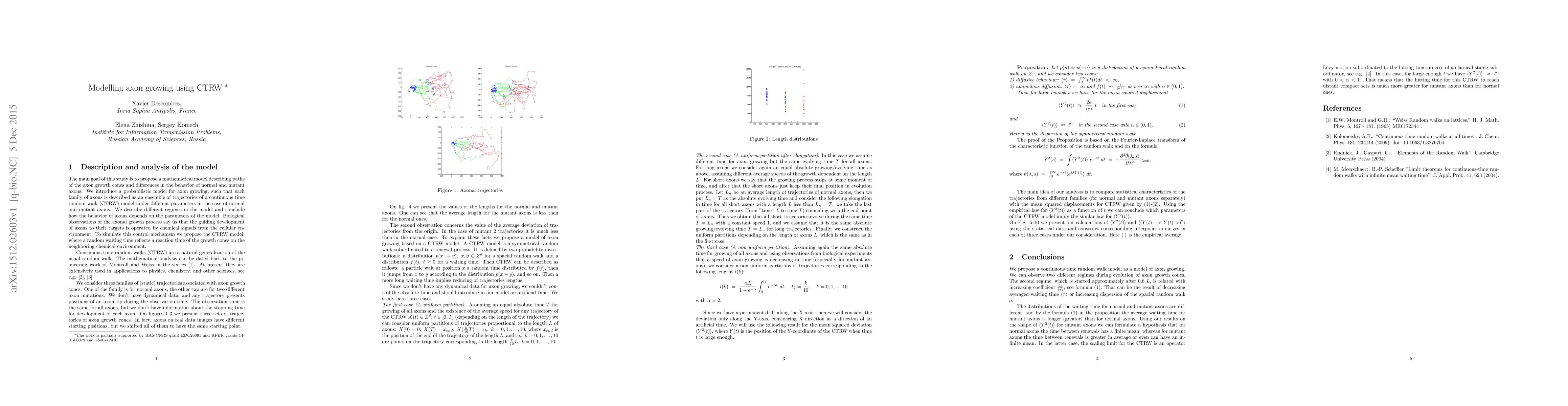 The main goal of this study is to propose a mathematical model describing paths of the axon growth cones and differences in the behavior of normal and mutant axons. We introduce a probabilistic model for axon growing, such that each family of axons is described as an ensemble of trajectories of a continuous time random walk (CTRW) model under different parameters in the case of normal and mutant axons. We describe different regimes in the model and conclude how the behavior of axons depends on the parameters of the model. Biological observations of the axonal growth process say us that the guiding development of axons to their targets is operated by chemical signals from the cellular environment. To simulate this control mechanism we propose the CTRW model, where a random waiting time reflects a reaction time of the growth cones on the neighboring chemical environment.