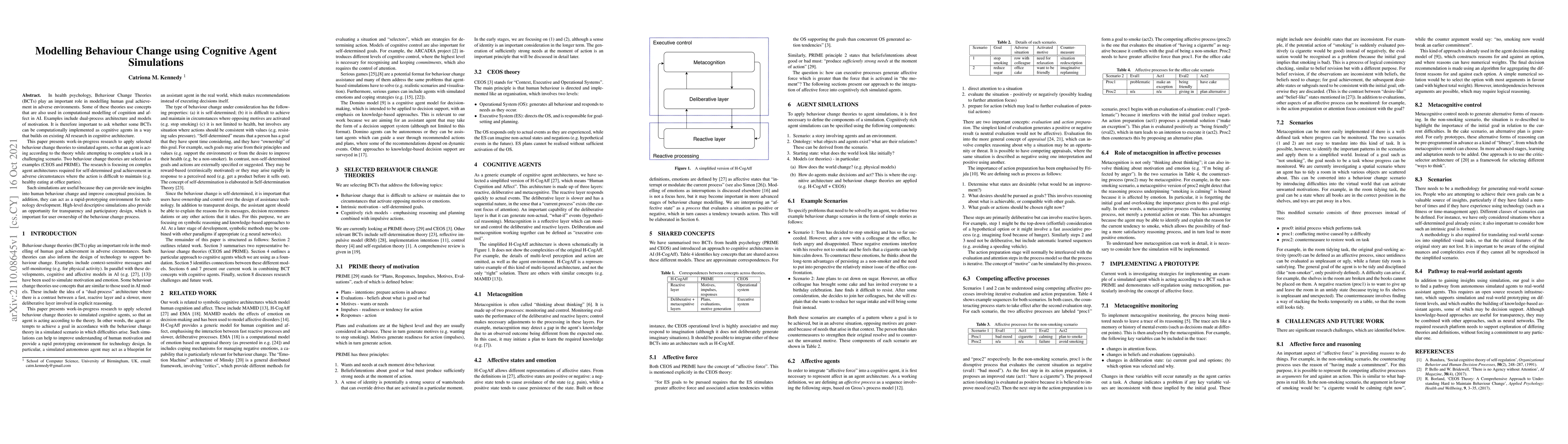 Researchers developed cognitive agent simulations to model human behavior change using two selected Behavior Change Theories, CEOS and PRIME, in challenging scenarios such as healthy eating at office parties.