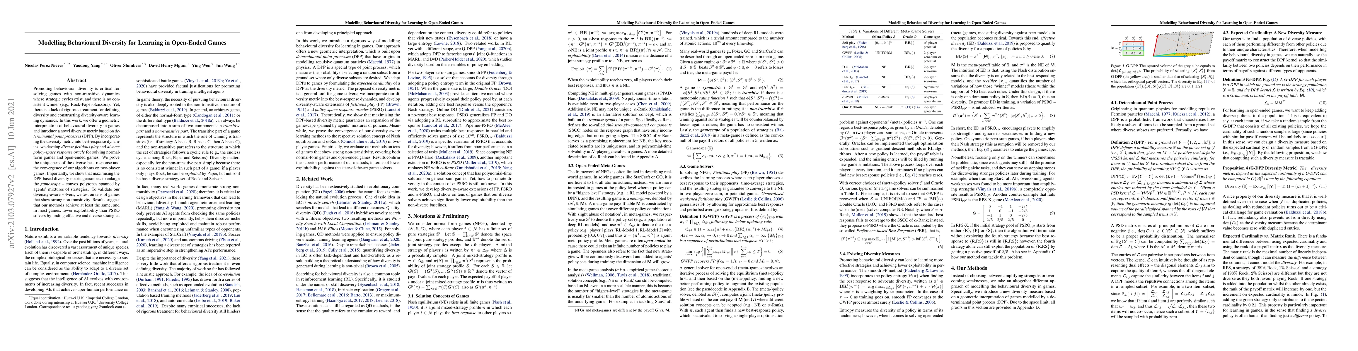 This paper introduces a novel metric for behavioural diversity based on determinantal point processes (DPP) to enhance learning dynamics in open-ended games with non-transitive dynamics. The proposed diverse fictitious play and policy-space response oracle algorithms achieve convergence and enlarge the gamescape, demonstrating effective and diverse strategy discovery.