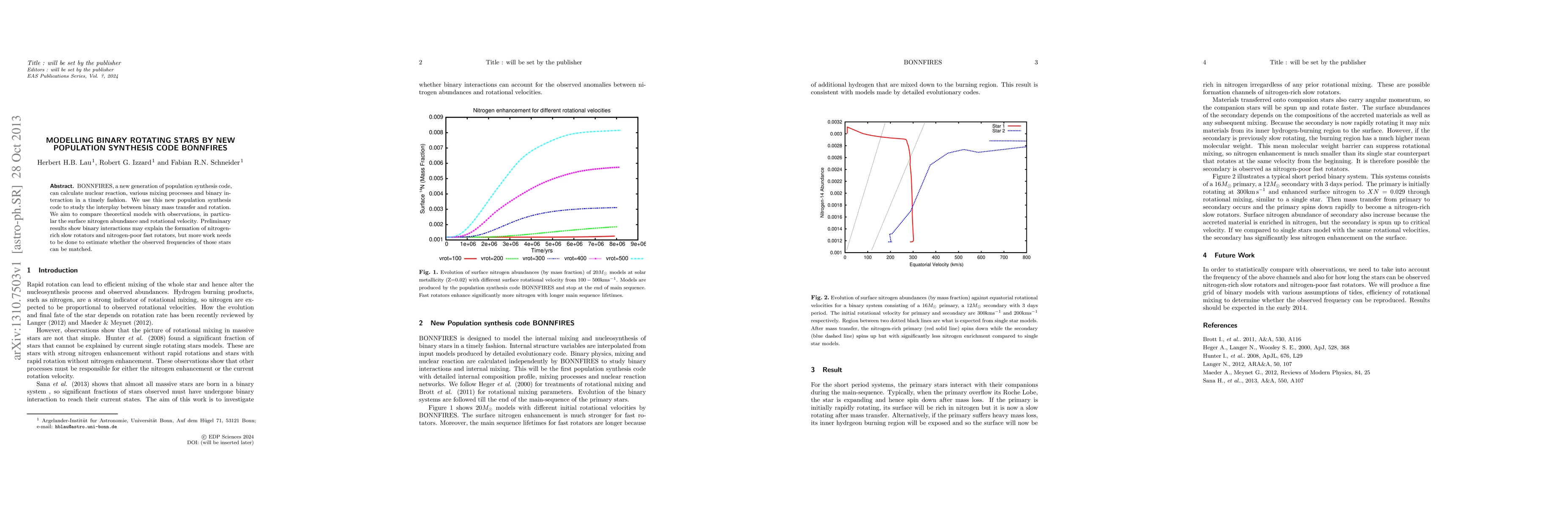 The BONNFIRES code models binary rotating stars by simulating nuclear reactions, mixing processes, and binary interactions. Preliminary results suggest binary mass transfer can explain the formation of nitrogen-rich slow rotators and nitrogen-poor fast rotators, though further study is needed to match observed frequencies.