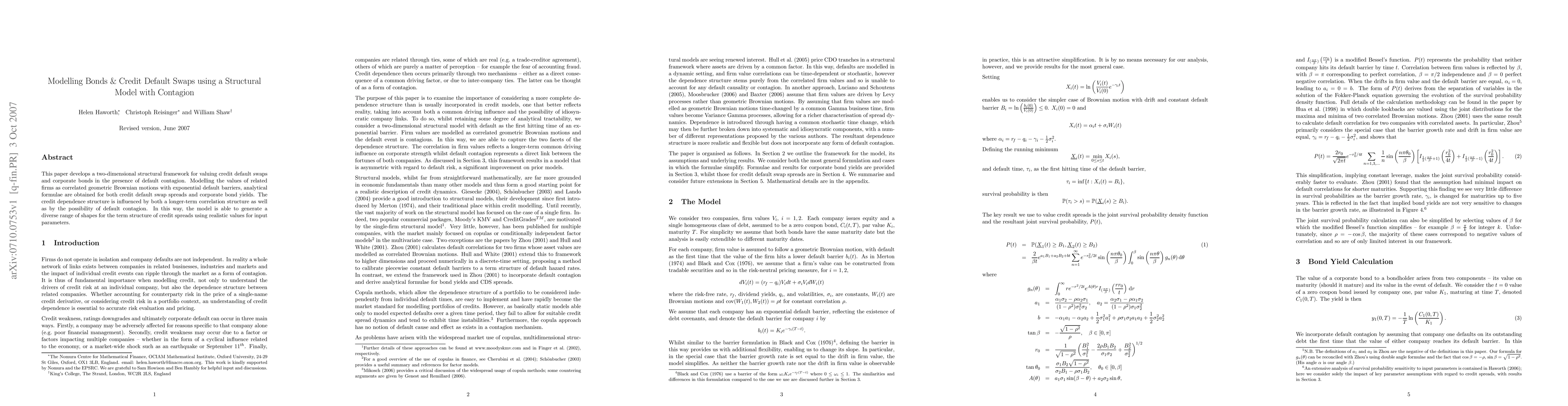 This paper proposes a two-dimensional structural model to value credit default swaps and corporate bonds, incorporating default contagion. The model uses correlated geometric Brownian motions with exponential default barriers to derive analytical formulae for credit default swap spreads and corporate bond yields, capturing diverse term structure shapes for credit spreads.