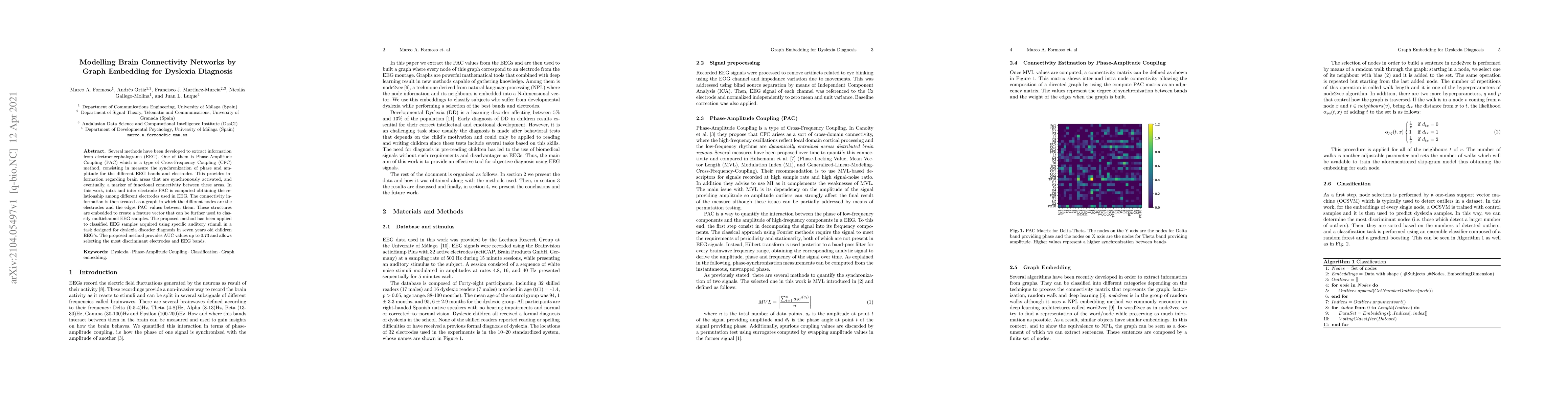 This research develops a method to classify EEG samples for dyslexia diagnosis using Phase-Amplitude Coupling (PAC) to model brain connectivity as a graph. The method achieves an AUC of up to 0.73 and identifies the most discriminative electrodes and EEG bands.