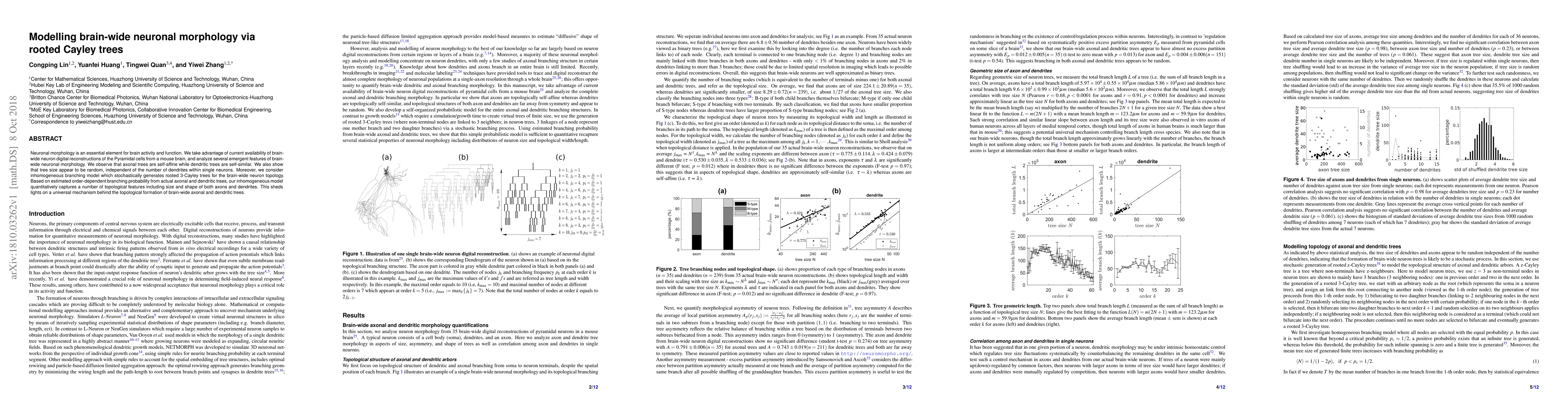 This paper models brain-wide neuronal morphology using rooted Cayley trees, demonstrating that axonal trees are self-affine while dendritic trees are self-similar. An inhomogeneous branching model stochastically generates these trees, capturing topological features and suggesting a universal mechanism for their formation.