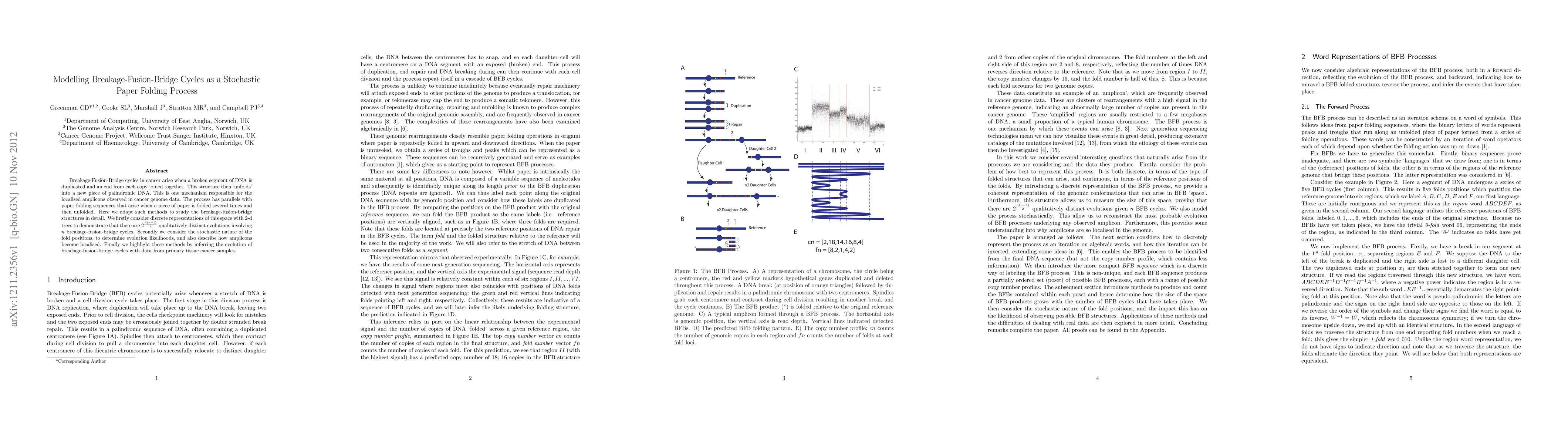 This paper models breakage-fusion-bridge cycles in cancer as a stochastic paper folding process, demonstrating 2^(n(n-1)/2) distinct evolutions using 2-d trees. It also explores the stochastic nature of fold positions to determine likelihoods and localize amplicons, applying these methods to infer cycle evolutions in primary tissue cancer samples.