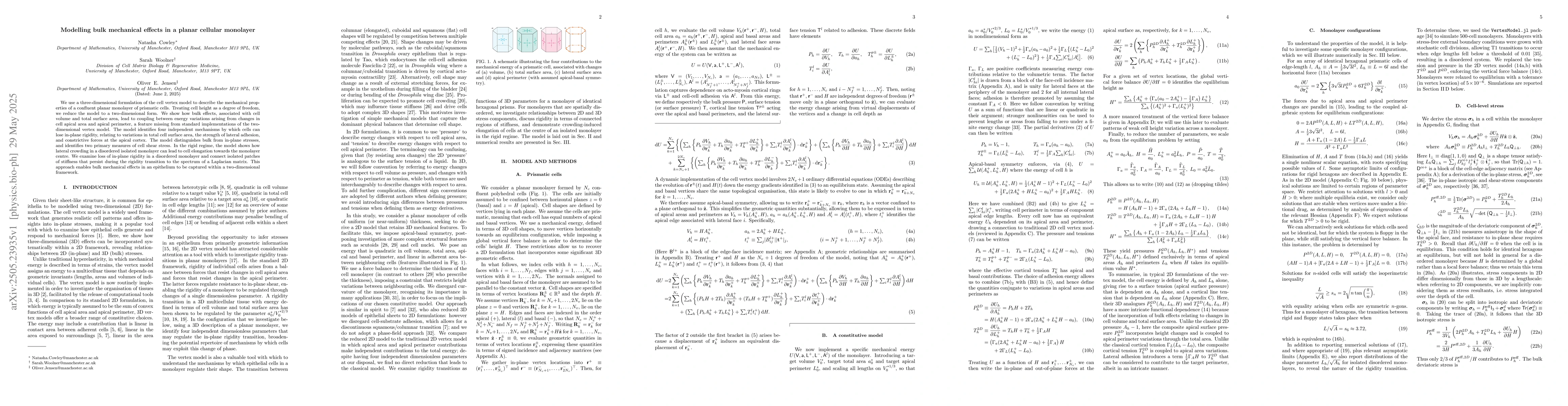 The research employs a three-dimensional cell vertex model to describe the mechanical properties of a confluent planar monolayer of prismatic cells, reducing it to a two-dimensional form to analyze bulk mechanical effects.