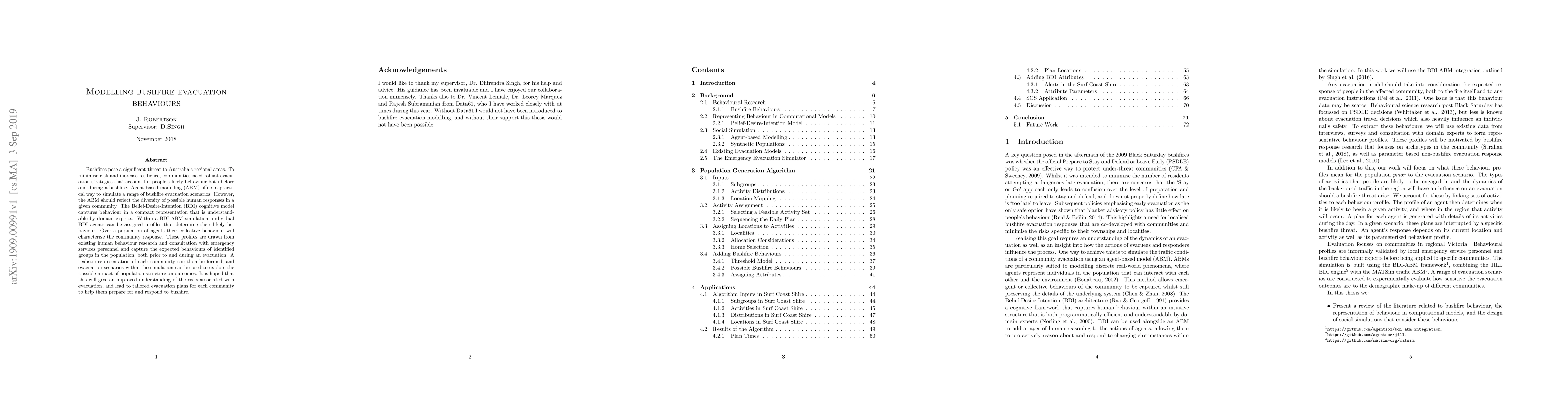 This research employs Agent-Based Modelling (ABM) using the Belief-Desire-Intention (BDI) cognitive model to simulate bushfire evacuation behaviors in Australian regional communities. By creating diverse agent profiles based on human behavior research and emergency services input, the study aims to understand how community structure impacts evacuation outcomes, leading to tailored evacuation plans for improved bushfire resilience.