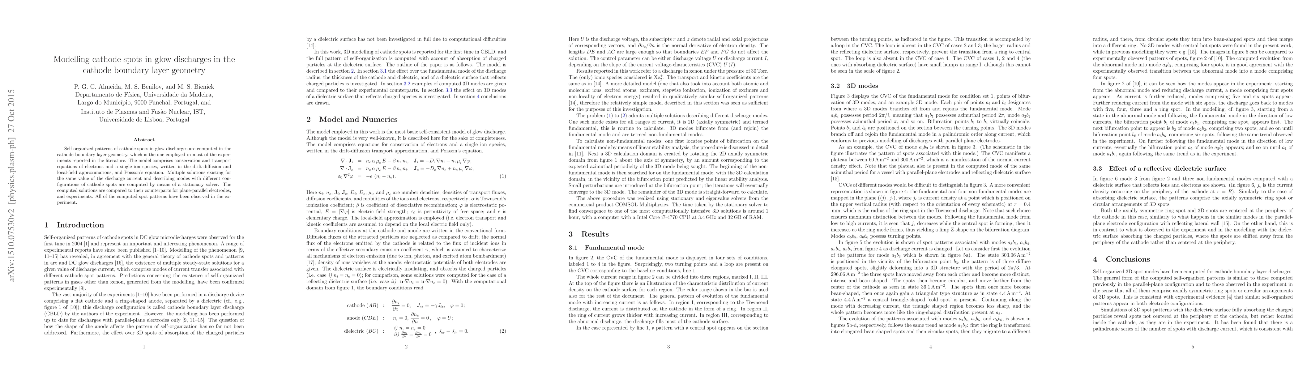 This paper models self-organized cathode spots in glow discharges using conservation and transport equations for electrons and ions, along with Poisson's equation. It finds multiple configurations of cathode spots for the same discharge current, validated by comparison with experimental observations.