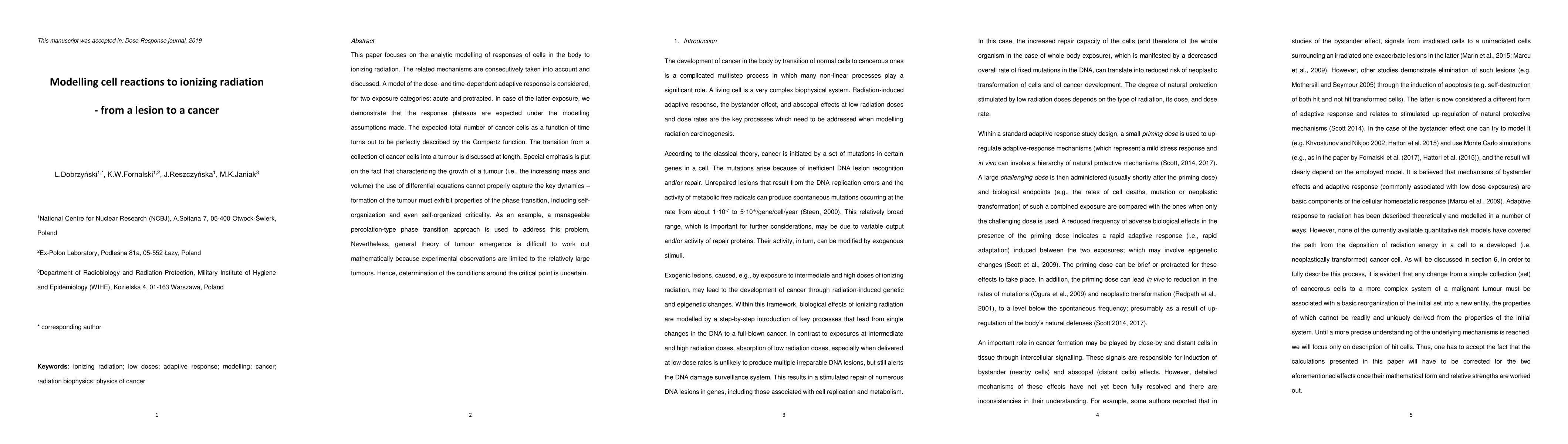 This paper focuses on the analytic modelling of responses of cells in the body to ionizing radiation. The related mechanisms are consecutively taken into account and discussed. A model of the dose- and time-dependent adaptive response is considered, for two exposure categories: acute and protracted. In case of the latter exposure, we demonstrate that the response plateaus are expected under the modelling assumptions made. The expected total number of cancer cells as a function of time turns out to be perfectly described by the Gompertz function. The transition from a collection of cancer cells into a tumour is discussed at length. Special emphasis is put on the fact that characterizing the growth of a tumour (i.e., the increasing mass and volume) the use of differential equations cannot properly capture the key dynamics - formation of the tumour must exhibit properties of the phase transition, including self-organization and even self-organized criticality. As an example, a manageable percolation-type phase transition approach is used to address this problem. Nevertheless, general theory of tumour emergence is difficult to work out mathematically because experimental observations are limited to the relatively large tumours. Hence, determination of the conditions around the critical point is uncertain.