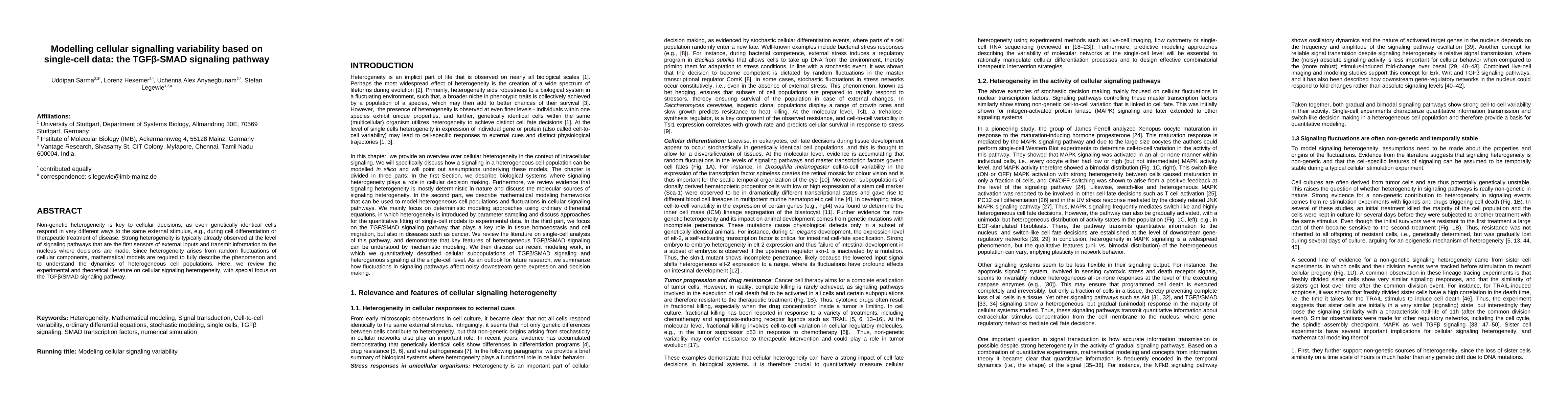 This paper reviews experimental and theoretical studies on cellular signaling heterogeneity, emphasizing the TGFb/SMAD signaling pathway. It highlights the importance of non-genetic variability in cellular responses to external stimuli and discusses mathematical models for understanding these dynamics.