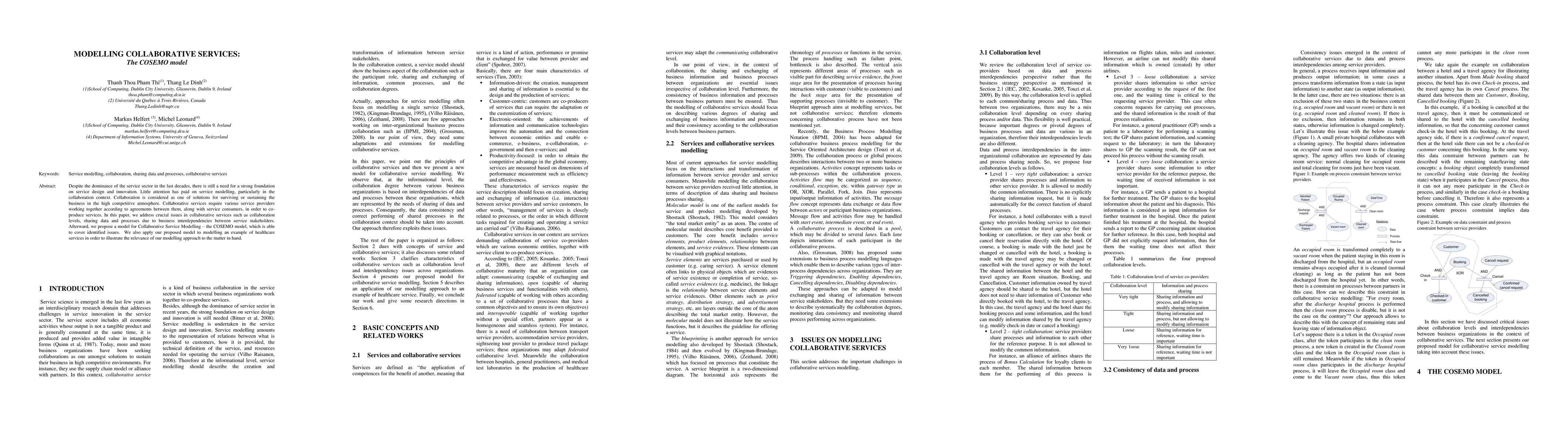 Despite the dominance of the service sector in the last decades, there is still a need for a strong foundation on service design and innovation. Little attention has paid on service modelling, particularly in the collaboration context. Collaboration is considered as one of solutions for surviving or sustaining the business in the high competitive atmosphere. Collaborative services require various service providers working together according to agreements between them, along with service consumers, in order to co-produce services. In this paper, we address crucial issues in collaborative services such as collaboration levels, sharing data and processes due to business inter-dependencies between service stakeholders. Afterward, we propose a model for Collaborative Service Modelling, which is able to cover identified issues. We also apply our proposed model to modelling an example of healthcare services in order to illustrate the relevance of our modelling approach to the matter in hand.