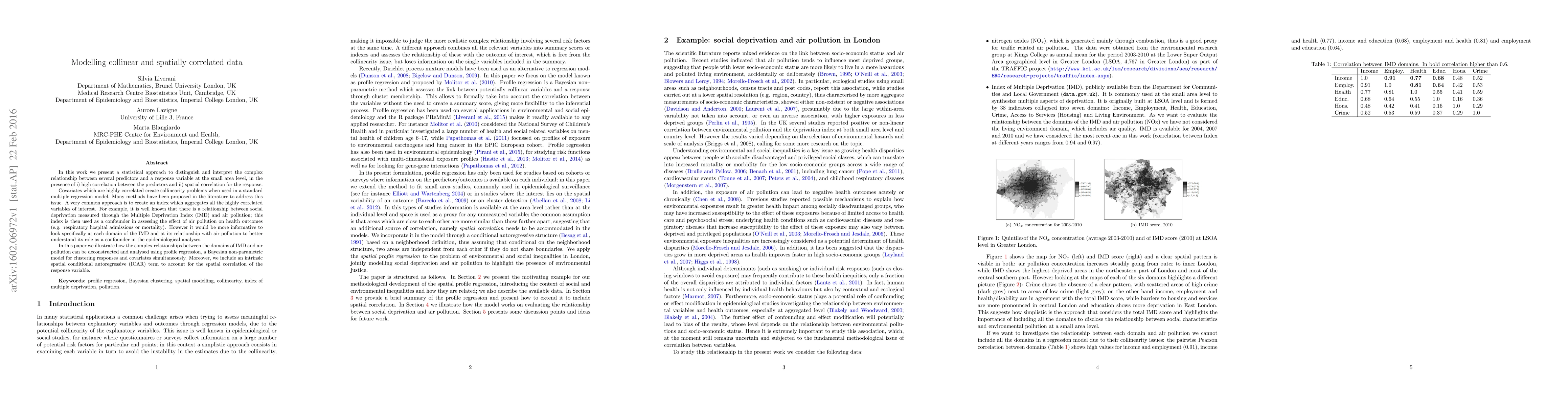 In this work we present a statistical approach to distinguish and interpret the complex relationship between several predictors and a response variable at the small area level, in the presence of i) high correlation between the predictors and ii) spatial correlation for the response. Covariates which are highly correlated create collinearity problems when used in a standard multiple regression model. Many methods have been proposed in the literature to address this issue. A very common approach is to create an index which aggregates all the highly correlated variables of interest. For example, it is well known that there is a relationship between social deprivation measured through the Multiple Deprivation Index (IMD) and air pollution; this index is then used as a confounder in assessing the effect of air pollution on health outcomes (e.g. respiratory hospital admissions or mortality). However it would be more informative to look specifically at each domain of the IMD and at its relationship with air pollution to better understand its role as a confounder in the epidemiological analyses. In this paper we illustrate how the complex relationships between the domains of IMD and air pollution can be deconstructed and analysed using profile regression, a Bayesian non-parametric model for clustering responses and covariates simultaneously. Moreover, we include an intrinsic spatial conditional autoregressive (ICAR) term to account for the spatial correlation of the response variable.