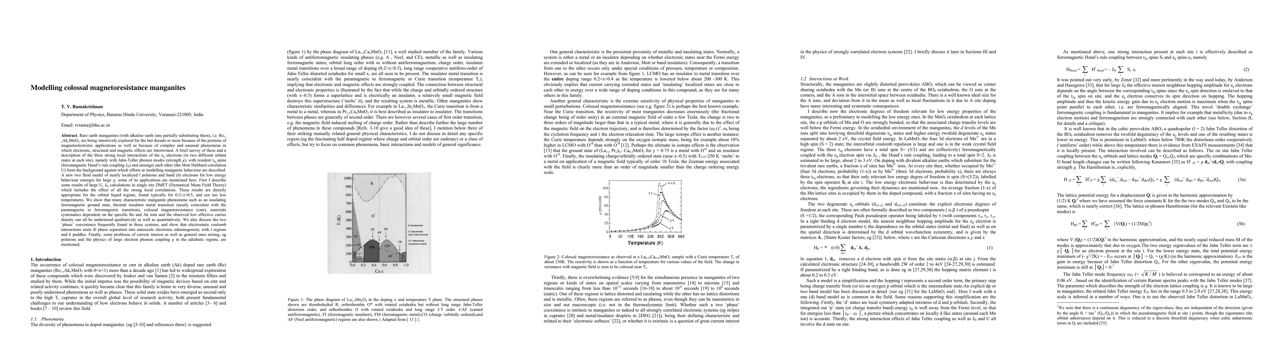 I briefly survey here attempts to model the rich and strange behaviour of colossal magnetoresistance manganites, after outlining some of the phenomena observed in them, and describing the three relevant strong local interactions of the e_g electrons (in two different orbital states at each site), namely with Jahn-Teller phonon modes (strength g), with resident t_2g spins (ferromagnetic Hund's rule coupling J_H) and amongst each other (the Mott Hubbard correlation U) . A new two fluid model of nearly localized l polarons and band (b) electrons for low energy behaviour emerges for large g; some of its applications are mentioned here. I describe some results of strong coupling U, J_H calculations in single site DMFT (Dynamical Mean Field Theory), and show that in the wide orbital liquid regime many characteristic manganite phenomena such as an insulating ferromagnetic ground state, thermal insulator metal transition, colossal magnetoresistance (cmr), materials systematics and the observed low effective carrier density can all be understood qualitatively and quantitatively. We also discuss the two 'phase' coexistence frequently found in these systems, and show that electrostatic coulomb interactions mute lb phase separation into nanoscale electronic inhomogeneity with l regions and b puddles. Finally, some problems of current interest as well as general ones arising, eg polarons and the physics of large electron phonon coupling g in the adiabatic regime, are mentioned.