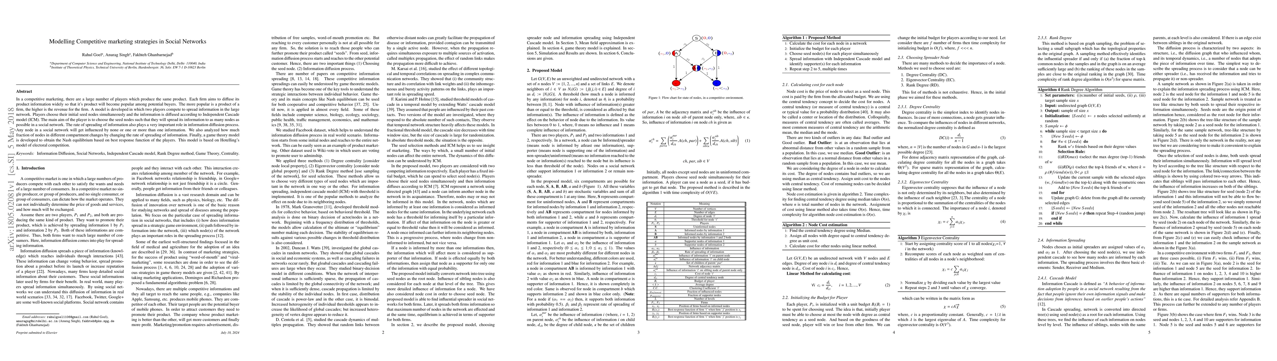 In a competitive marketing, there are a large number of players which produce the same product. Each firm aims to diffuse its product information widely so that it's product will become popular among potential buyers. The more popular is a product of a firm, the higher is the revenue for the firm. A model is developed in which two players compete to spread information in the large network. Players choose their initial seed nodes simultaneously and the information is diffused according to Independent Cascade model (ICM). The main aim of the player is to choose the seed nodes such that they will spread its information to as many nodes as possible in a social network. The rate of spreading of information also plays a very important role in information diffusion process. Any node in a social network will get influenced by none or one or more than one information. We also analyzed how much fraction of nodes in different compartment changes by changing the rate of spreading of information. Finally, a game theory model is developed to obtain the Nash equilibrium based on best response function of the players. This model is based on Hotelling's model of electoral competition.