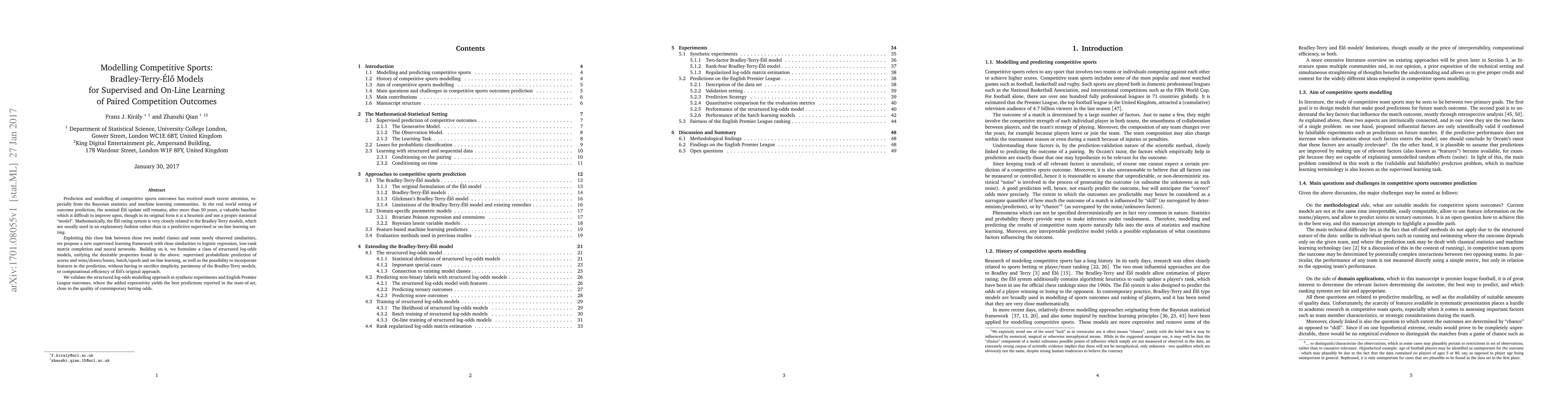 Prediction and modelling of competitive sports outcomes has received much recent attention, especially from the Bayesian statistics and machine learning communities. In the real world setting of outcome prediction, the seminal \'{E}l\H{o} update still remains, after more than 50 years, a valuable baseline which is difficult to improve upon, though in its original form it is a heuristic and not a proper statistical "model". Mathematically, the \'{E}l\H{o} rating system is very closely related to the Bradley-Terry models, which are usually used in an explanatory fashion rather than in a predictive supervised or on-line learning setting. Exploiting this close link between these two model classes and some newly observed similarities, we propose a new supervised learning framework with close similarities to logistic regression, low-rank matrix completion and neural networks. Building on it, we formulate a class of structured log-odds models, unifying the desirable properties found in the above: supervised probabilistic prediction of scores and wins/draws/losses, batch/epoch and on-line learning, as well as the possibility to incorporate features in the prediction, without having to sacrifice simplicity, parsimony of the Bradley-Terry models, or computational efficiency of \'{E}l\H{o}'s original approach. We validate the structured log-odds modelling approach in synthetic experiments and English Premier League outcomes, where the added expressivity yields the best predictions reported in the state-of-art, close to the quality of contemporary betting odds.