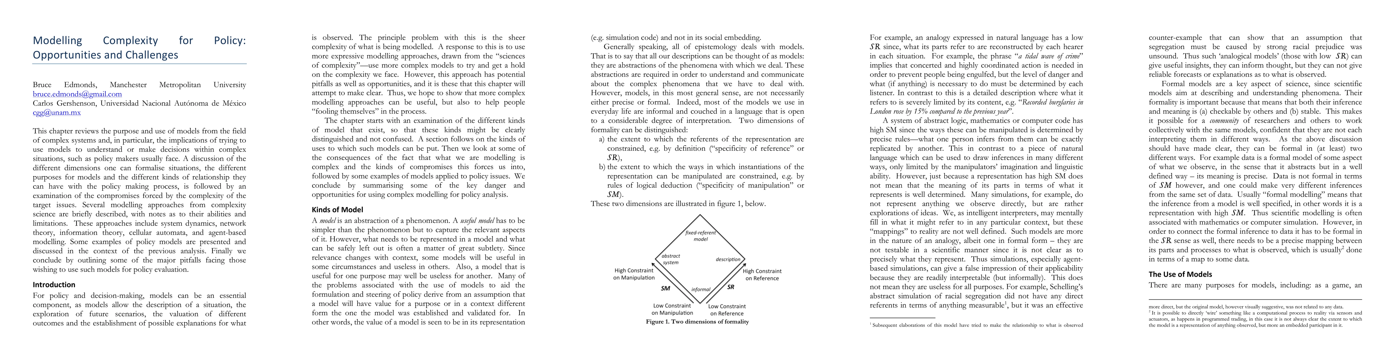 This chapter reviews modeling approaches for complex systems to inform policy decisions, highlighting their capabilities and limitations, as well as common pitfalls in using models for policy evaluation.