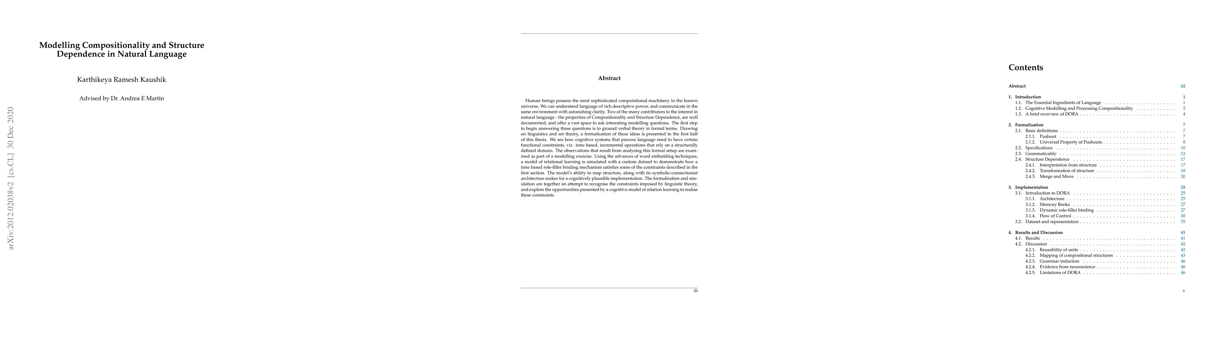 Human beings possess the most sophisticated computational machinery in the known universe. We can understand language of rich descriptive power, and communicate in the same environment with astonishing clarity. Two of the many contributors to the interest in natural language - the properties of Compositionality and Structure Dependence, are well documented, and offer a vast space to ask interesting modelling questions. The first step to begin answering these questions is to ground verbal theory in formal terms. Drawing on linguistics and set theory, a formalisation of these ideas is presented in the first half of this thesis. We see how cognitive systems that process language need to have certain functional constraints, viz. time based, incremental operations that rely on a structurally defined domain. The observations that result from analysing this formal setup are examined as part of a modelling exercise. Using the advances of word embedding techniques, a model of relational learning is simulated with a custom dataset to demonstrate how a time based role-filler binding mechanism satisfies some of the constraints described in the first section. The model's ability to map structure, along with its symbolic-connectionist architecture makes for a cognitively plausible implementation. The formalisation and simulation are together an attempt to recognise the constraints imposed by linguistic theory, and explore the opportunities presented by a cognitive model of relation learning to realise these constraints.