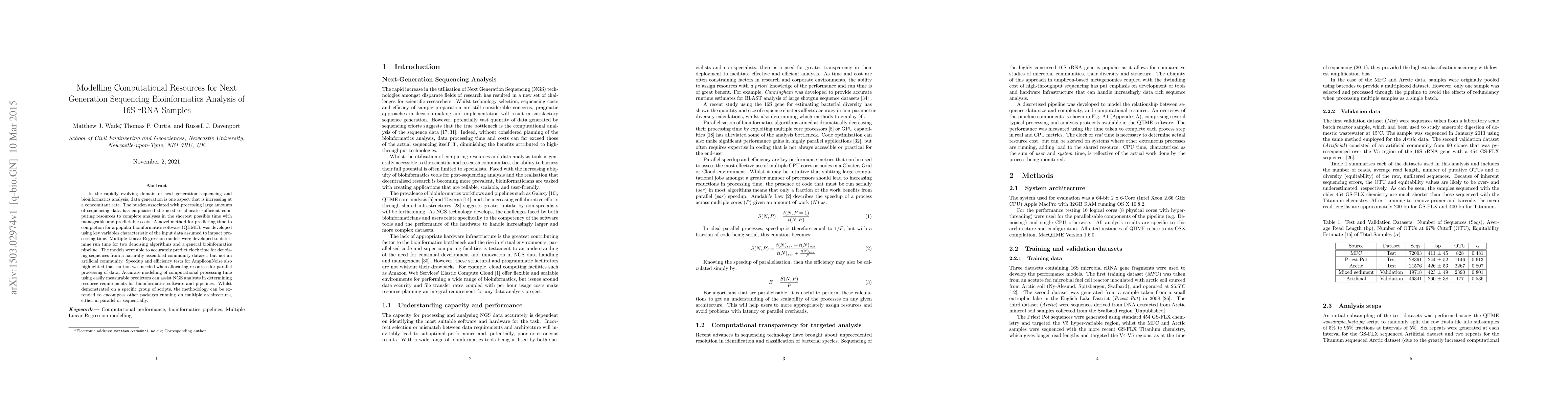 In the rapidly evolving domain of next generation sequencing and bioinformatics analysis, data generation is one aspect that is increasing at a concomitant rate. The burden associated with processing large amounts of sequencing data has emphasised the need to allocate sufficient computing resources to complete analyses in the shortest possible time with manageable and predictable costs. A novel method for predicting time to completion for a popular bioinformatics software (QIIME), was developed using key variables characteristic of the input data assumed to impact processing time. Multiple Linear Regression models were developed to determine run time for two denoising algorithms and a general bioinformatics pipeline. The models were able to accurately predict clock time for denoising sequences from a naturally assembled community dataset, but not an artificial community. Speedup and efficiency tests for AmpliconNoise also highlighted that caution was needed when allocating resources for parallel processing of data. Accurate modelling of computational processing time using easily measurable predictors can assist NGS analysts in determining resource requirements for bioinformatics software and pipelines. Whilst demonstrated on a specific group of scripts, the methodology can be extended to encompass other packages running on multiple architectures, either in parallel or sequentially.