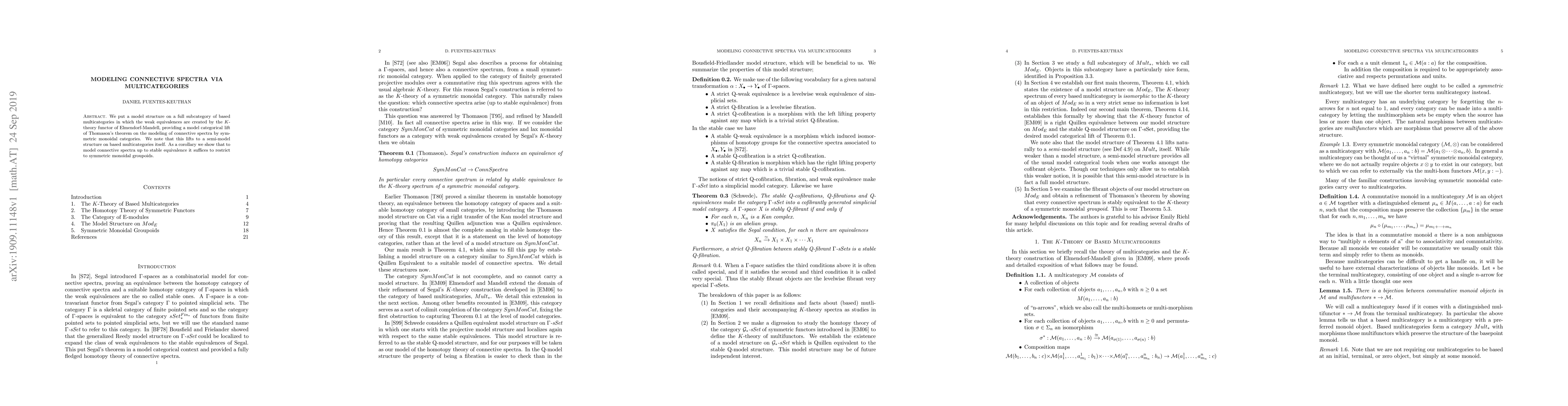 This paper models connective spectra using a full subcategory of based multicategories, employing the K-theory functor to create weak equivalences, thereby lifting Thomason's theorem. It also extends this to a semi-model structure on based multicategories, concluding that symmetric monoidal groupoids suffice for modeling connective spectra.