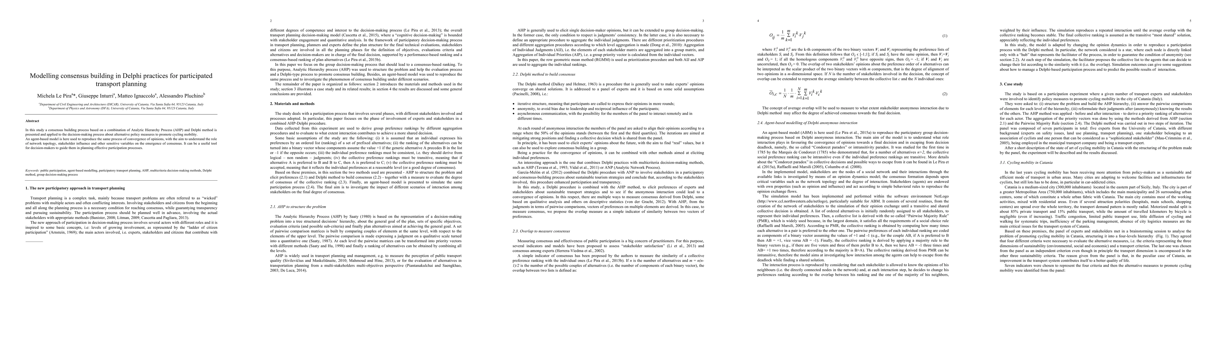 A study applies a combination of Analytic Hierarchy Process and Delphi method to promote cycling mobility through consensus building in transport planning. An agent-based model is used to analyze the emergence of consensus and its factors.