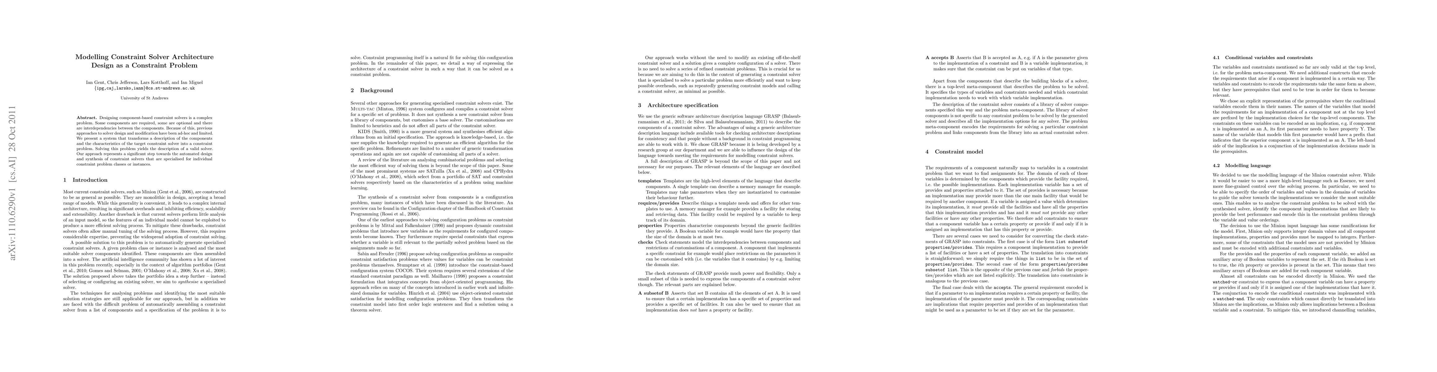 This paper proposes a method to model the design of component-based constraint solvers as a constraint problem, enabling automated generation of specialized solvers tailored to specific problem classes or instances. The approach transforms component descriptions and solver characteristics into a constraint problem, which is then solved to yield a valid solver design.