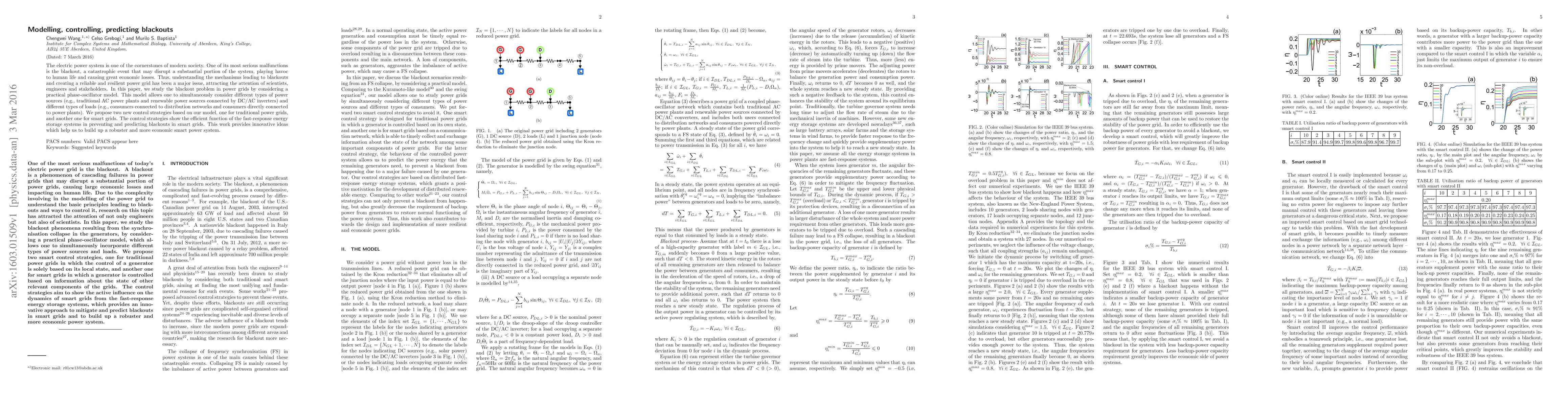 The electric power system is one of the cornerstones of modern society. One of its most serious malfunctions is the blackout, a catastrophic event that may disrupt a substantial portion of the system, playing havoc to human life and causing great economic losses. Thus, understanding the mechanisms leading to blackouts and creating a reliable and resilient power grid has been a major issue, attracting the attention of scientists, engineers and stakeholders. In this paper, we study the blackout problem in power grids by considering a practical phase-oscillator model. This model allows one to simultaneously consider different types of power sources (e.g., traditional AC power plants and renewable power sources connected by DC/AC inverters) and different types of loads (e.g., consumers connected to distribution networks and consumers directly connected to power plants). We propose two new control strategies based on our model, one for traditional power grids, and another one for smart grids. The control strategies show the efficient function of the fast-response energy storage systems in preventing and predicting blackouts in smart grids. This work provides innovative ideas which help us to build up a robuster and more economic smart power system.