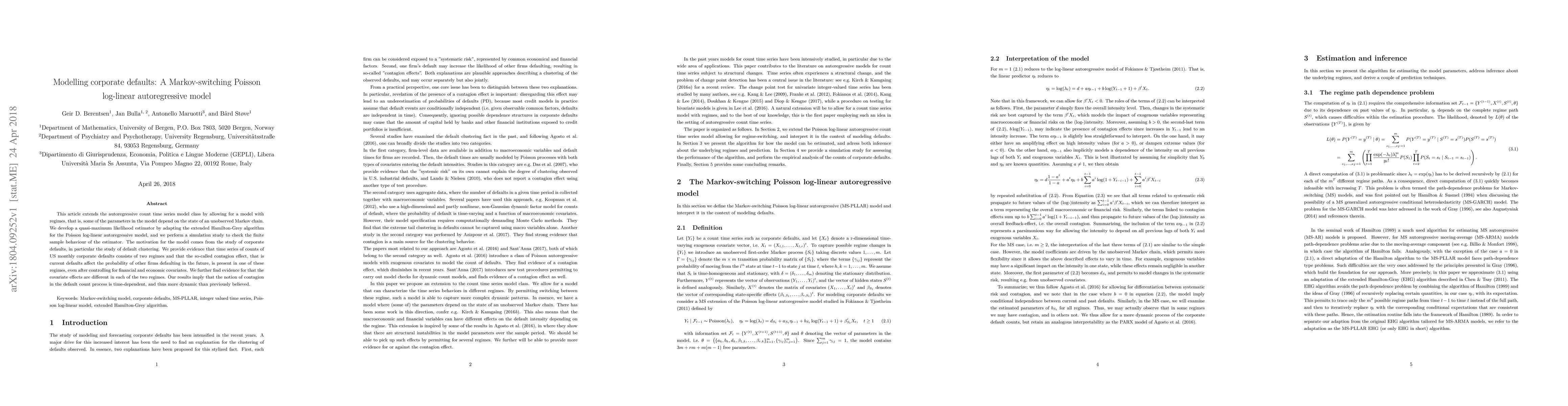 This paper introduces a Markov-switching Poisson log-linear autoregressive model to study corporate defaults, revealing two regimes with different covariate effects and a time-dependent contagion effect influencing future defaults. The model's performance is validated through a simulation study.