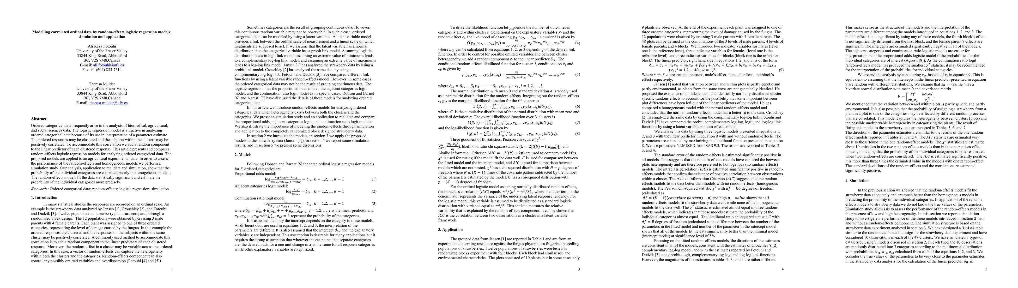 This paper proposes and evaluates random-effects logistic regression models for analyzing correlated ordinal data, demonstrating their superior performance over homogeneous models through simulation and application to agricultural data. The results indicate that random-effects models provide more precise estimates of individual category probabilities.