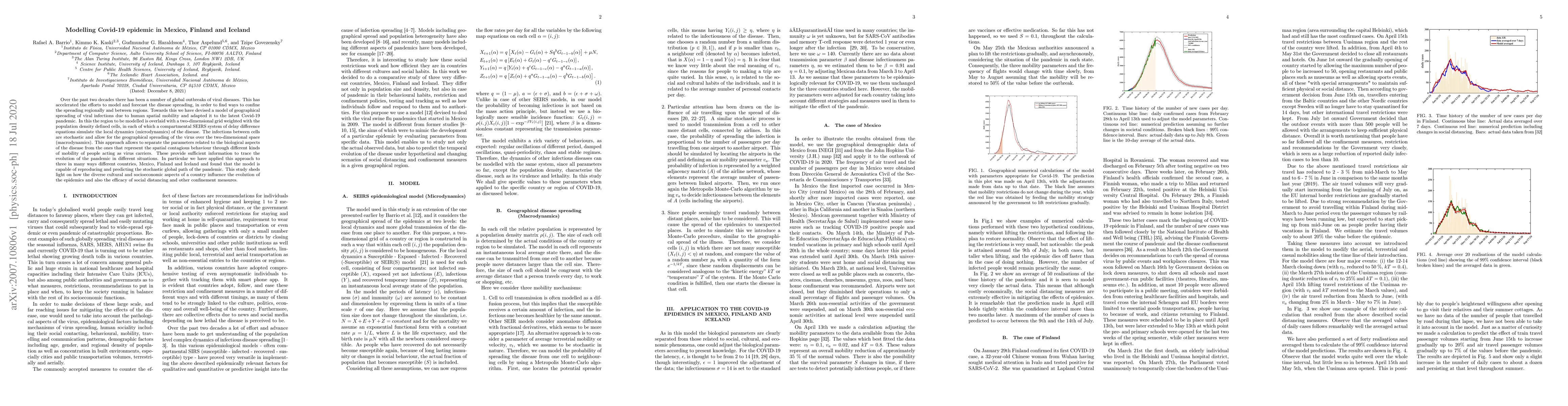 Over the past two decades there has been a number of global outbreaks of viral diseases. This has accelerated the efforts to model and forecast the disease spreading, in order to find ways to confine the spreading regionally and between regions. Towards this we have devised a model of geographical spreading of viral infections due to human spatial mobility and adapted it to the latest COVID-19 pandemic. In this the region to be modelled is overlaid with a two-dimensional grid weighted with the population density defined cells, in each of which a compartmental SEIRS system of delay difference equations simulate the local dynamics (microdynamics) of the disease. The infections between cells are stochastic and allow for the geographical spreading of the virus over the two-dimensional space (macrodynamics). This approach allows to separate the parameters related to the biological aspects of the disease from the ones that represent the spatial contagious behaviour through different kinds of mobility of people acting as virus carriers. These provide sufficient information to trace the evolution of the pandemic in different situations. In particular we have applied this approach to three in many ways different countries, Mexico, Finland and Iceland and found that the model is capable of reproducing and predicting the stochastic global path of the pandemic. This study sheds light on how the diverse cultural and socioeconomic aspects of a country influence the evolution of the epidemics and also the efficacy of social distancing and other confinement measures.