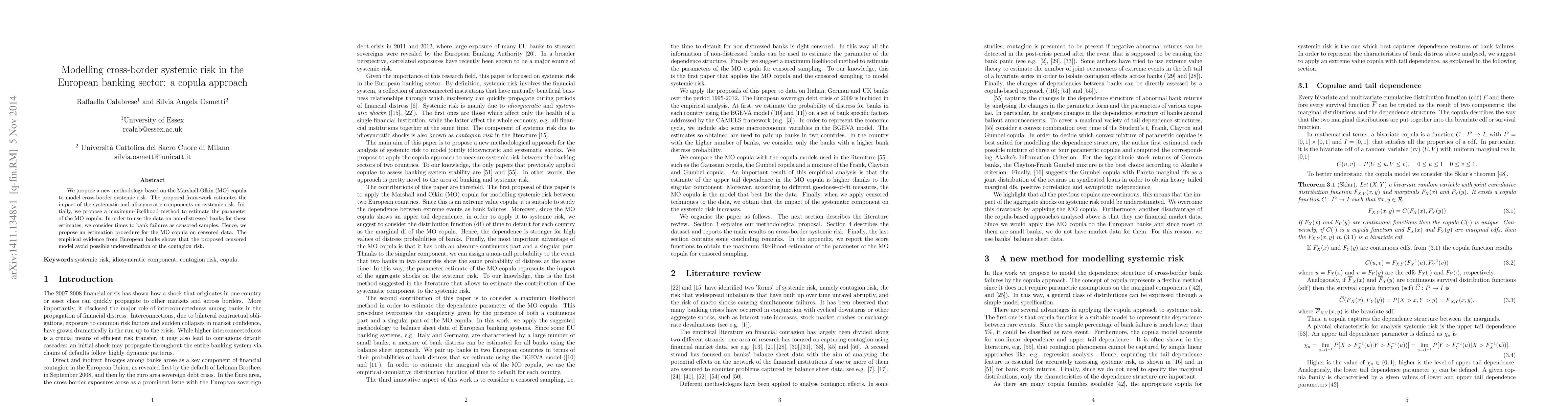 The paper introduces a Marshall-Olkin copula methodology to model cross-border systemic risk in the European banking sector, employing a maximum-likelihood approach for parameter estimation on censored bank failure data. The results indicate that the censored model better captures contagion risk compared to traditional methods.