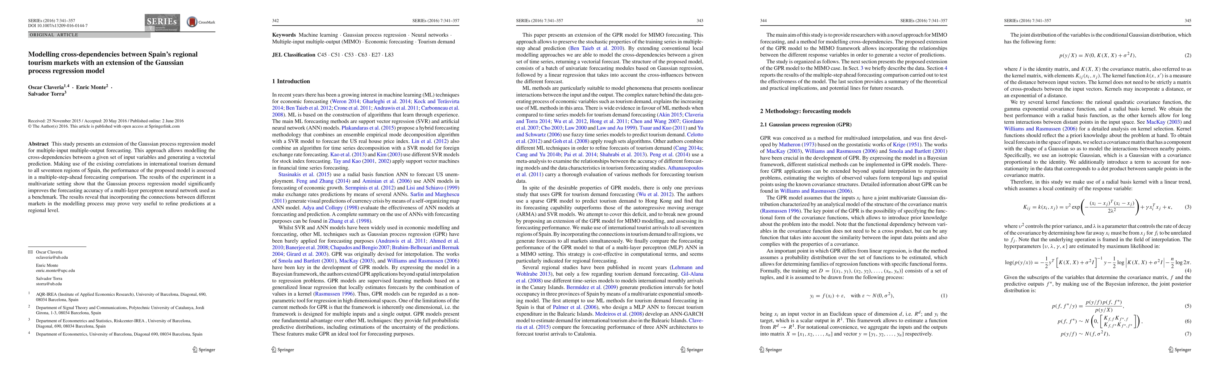 This study extends the Gaussian process regression model for multiple-input multiple-output forecasting to model cross-dependencies between Spain's regional tourism markets. The proposed model significantly improves forecasting accuracy compared to a neural network benchmark, highlighting the benefits of incorporating market connections for refined regional predictions.