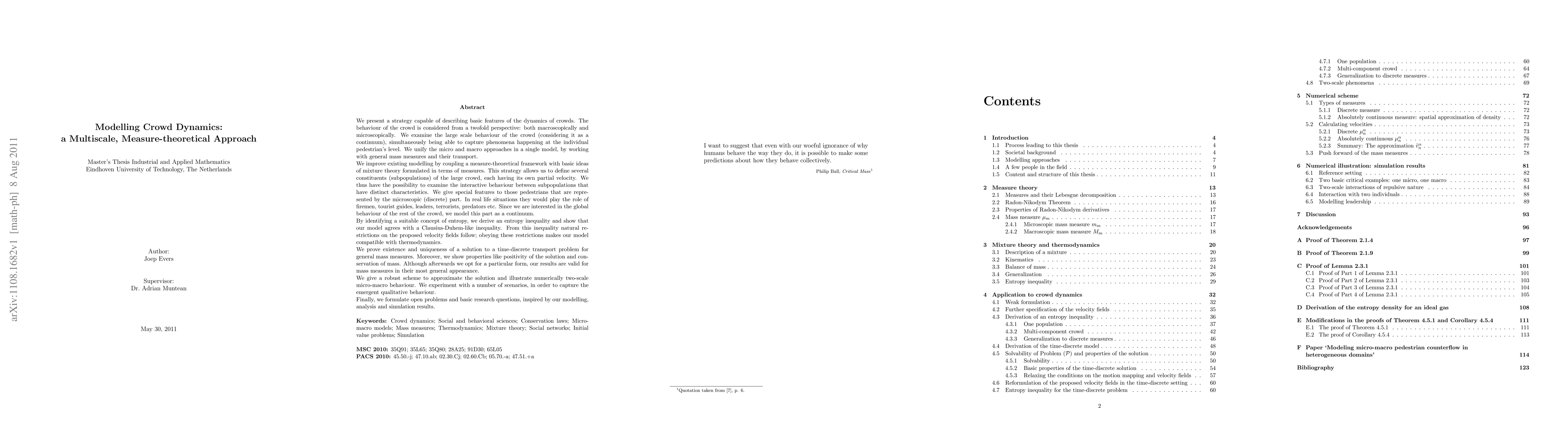 We present a strategy capable of describing basic features of the dynamics of crowds. The behaviour of the crowd is considered from a twofold perspective. We examine both the large scale behaviour of the crowd, and phenomena happening at the individual pedestrian's level. We unify micro and macro in a single model, by working with general mass measures and their transport. We improve existing modelling by coupling a measure-theoretical framework with basic ideas of mixture theory formulated in terms of measures. This strategy allows us to define several constituents of the crowd, each having its own partial velocity. We can thus examine the interaction between subpopulations that have distinct characteristics. We give special features to those pedestrians that are represented by the microscopic (discrete) part. In real life they would play the role of leaders, predators etc. Since we are interested in the global behaviour of the rest of the crowd, we model this part as a continuum. By identifying a suitable concept of entropy, we derive an entropy inequality and show that our model agrees with a Clausius-Duhem-like inequality. From this inequality natural restrictions on the proposed velocity fields follow; obeying these restrictions makes our model compatible with thermodynamics. We prove existence and uniqueness of a solution to a time-discrete transport problem for general mass measures. Moreover, we show properties like positivity of the solution and conservation of mass. Our results are valid for mass measures in their most general appearance. We give a robust scheme to approximate the solution and illustrate numerically two-scale micro-macro behaviour. We experiment with a number of scenarios, in order to capture the emergent qualitative behaviour. Finally, we formulate open problems and basic research questions, inspired by our modelling, analysis and simulation results.