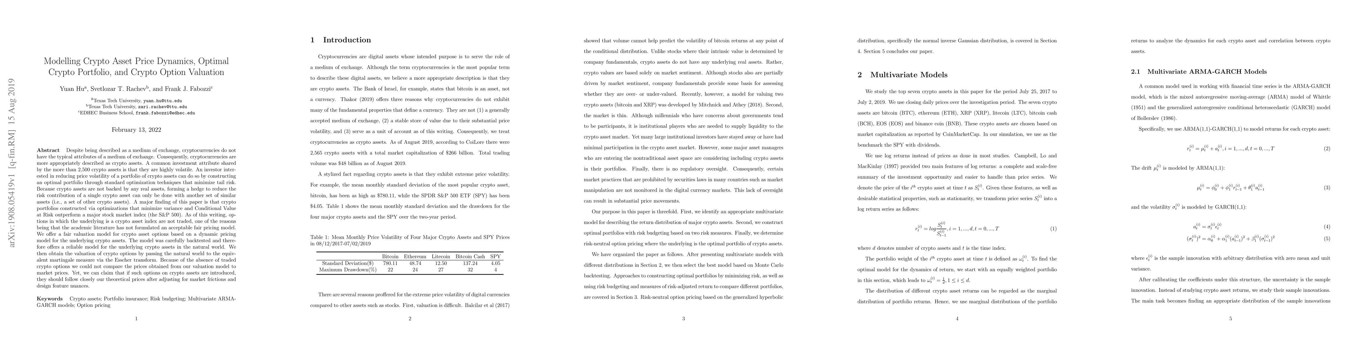 Despite being described as a medium of exchange, cryptocurrencies do not have the typical attributes of a medium of exchange. Consequently, cryptocurrencies are more appropriately described as crypto assets. A common investment attribute shared by the more than 2,500 crypto assets is that they are highly volatile. An investor interested in reducing price volatility of a portfolio of crypto assets can do so by constructing an optimal portfolio through standard optimization techniques that minimize tail risk. Because crypto assets are not backed by any real assets, forming a hedge to reduce the risk contribution of a single crypto asset can only be done with another set of similar assets (i.e., a set of other crypto assets). A major finding of this paper is that crypto portfolios constructed via optimizations that minimize variance and Conditional Value at Risk outperform a major stock market index (the S$\&$P 500). As of this writing, options in which the underlying is a crypto asset index are not traded, one of the reasons being that the academic literature has not formulated an acceptable fair pricing model. We offer a fair valuation model for crypto asset options based on a dynamic pricing model for the underlying crypto assets. The model was carefully backtested and therefore offers a reliable model for the underlying crypto assets in the natural world. We then obtain the valuation of crypto options by passing the natural world to the equivalent martingale measure via the Esscher transform. Because of the absence of traded crypto options we could not compare the prices obtained from our valuation model to market prices. Yet, we can claim that if such options on crypto assets are introduced, they should follow closely our theoretical prices after adjusting for market frictions and design feature nuances.