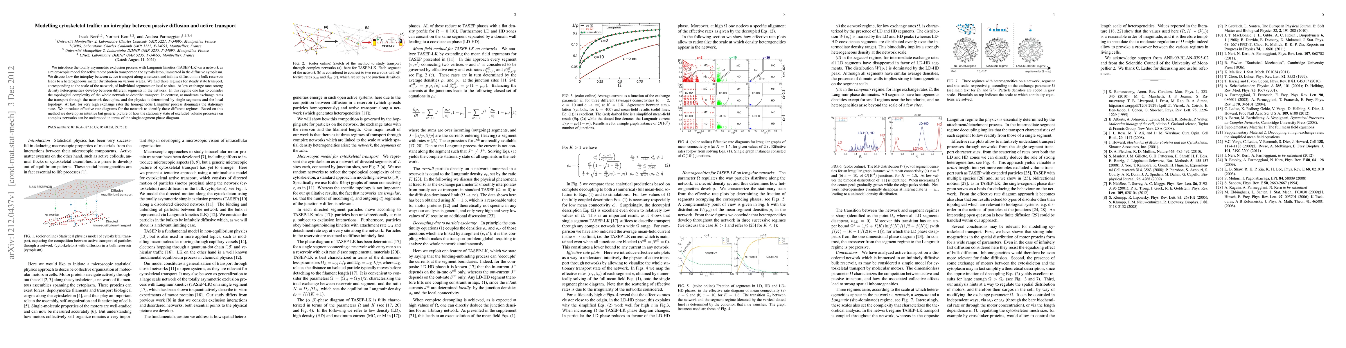 We introduce the totally asymmetric exclusion process with Langmuir kinetics (TASEP-LK) on a network as a microscopic model for active motor protein transport on the cytoskeleton, immersed in the diffusive cytoplasm. We discuss how the interplay between active transport along a network and infinite diffusion in a bulk reservoir leads to a heterogeneous matter distribution on various scales. We find three regimes for steady state transport, corresponding to the scale of the network, of individual segments or local to sites. At low exchange rates strong density heterogeneities develop between different segments in the network. In this regime one has to consider the topological complexity of the whole network to describe transport. In contrast, at moderate exchange rates the transport through the network decouples, and the physics is determined by single segments and the local topology. At last, for very high exchange rates the homogeneous Langmuir process dominates the stationary state. We introduce effective rate diagrams for the network to identify these different regimes. Based on this method we develop an intuitive but generic picture of how the stationary state of excluded volume processes on complex networks can be understood in terms of the single-segment phase diagram.