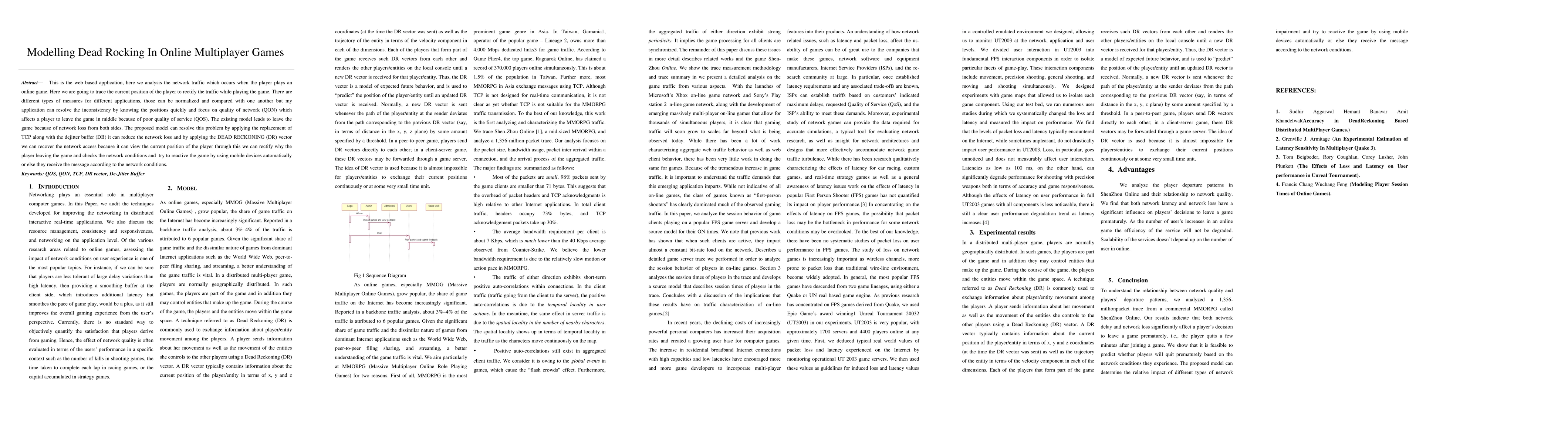 This is the web based application, here we analysis the network traffic which occurs when the player plays an online game. Here we are going to trace the current position of the player to rectify the traffic while playing the game. There are different types of measures for different applications, those can be normalized and compared with one another but my application can resolve the inconsistency by knowing the positions quickly and focus on quality of network (QON) which affects a player to leave the game in middle because of poor quality of service (QOS). The existing model leads to leave the game because of network loss from both sides. The proposed model can resolve this problem by applying the replacement of TCP along with the dejitter buffer (DB) it can reduce the network loss and by applying the DEAD RECKONING (DR) vector we can recover the network access because it can view the current position of the player through this we can rectify why the player leaving the game and checks the network conditions and try to reactive the game by using mobile devices automatically or else they receive the message according to the network conditions.