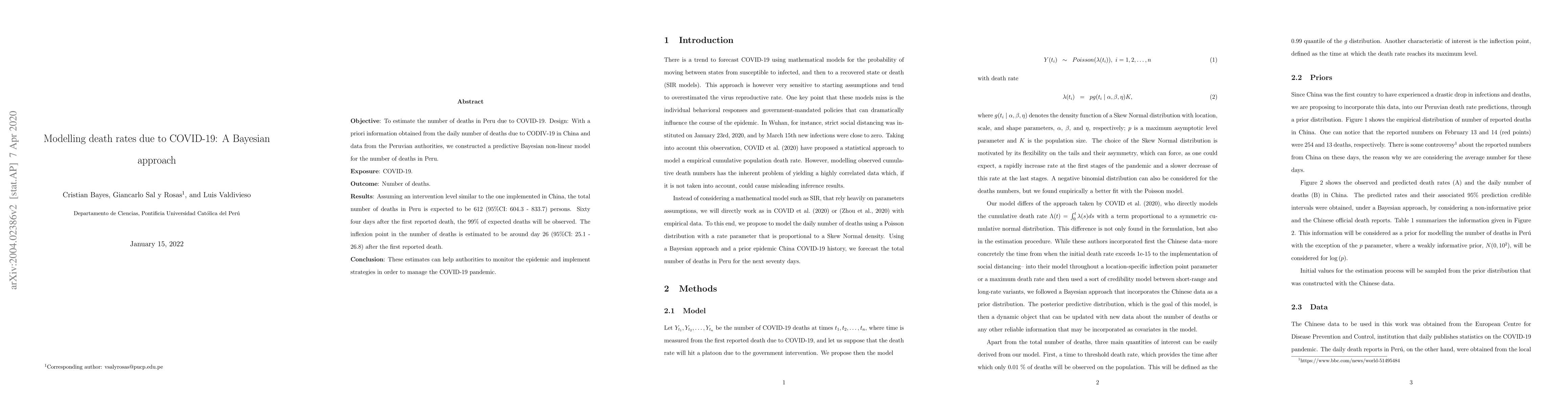 This study uses a Bayesian non-linear model to estimate COVID-19 death rates in Peru, projecting 612 deaths (95% CI: 604.3 - 833.7) with an intervention level similar to China, and suggests that 99% of expected deaths will be observed 64 days post-first case. The model aids in epidemic monitoring and strategy implementation.