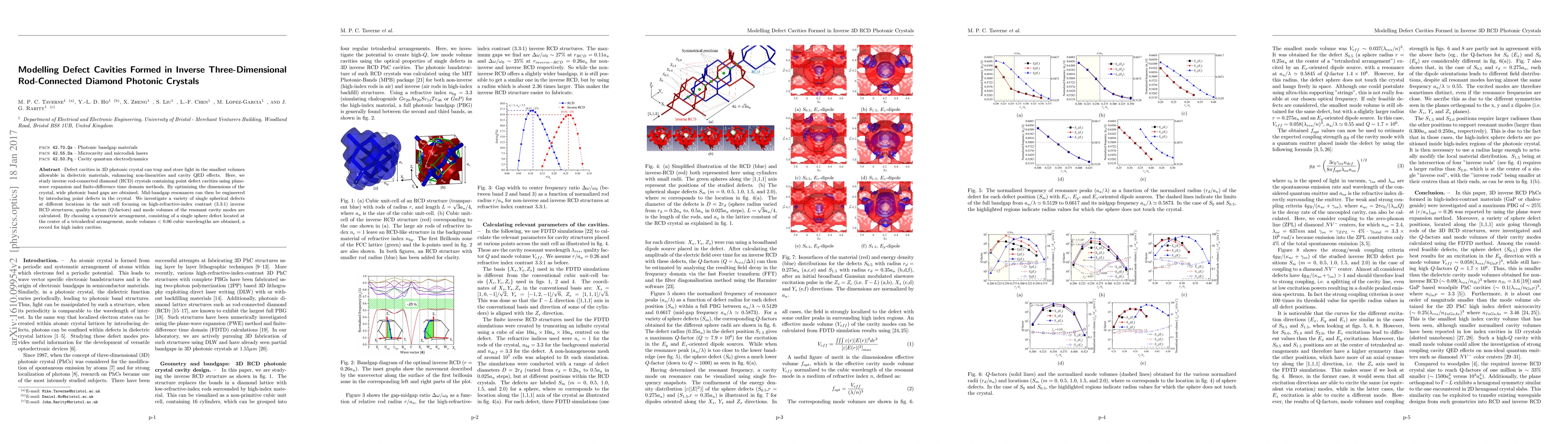 This paper models defect cavities in inverse 3D rod-connected diamond photonic crystals, optimizing their dimensions to achieve wide photonic band gaps and mid-bandgap resonances. High-refractive-index contrast structures yield record-low mode volumes and high Q-factors for resonant cavities.