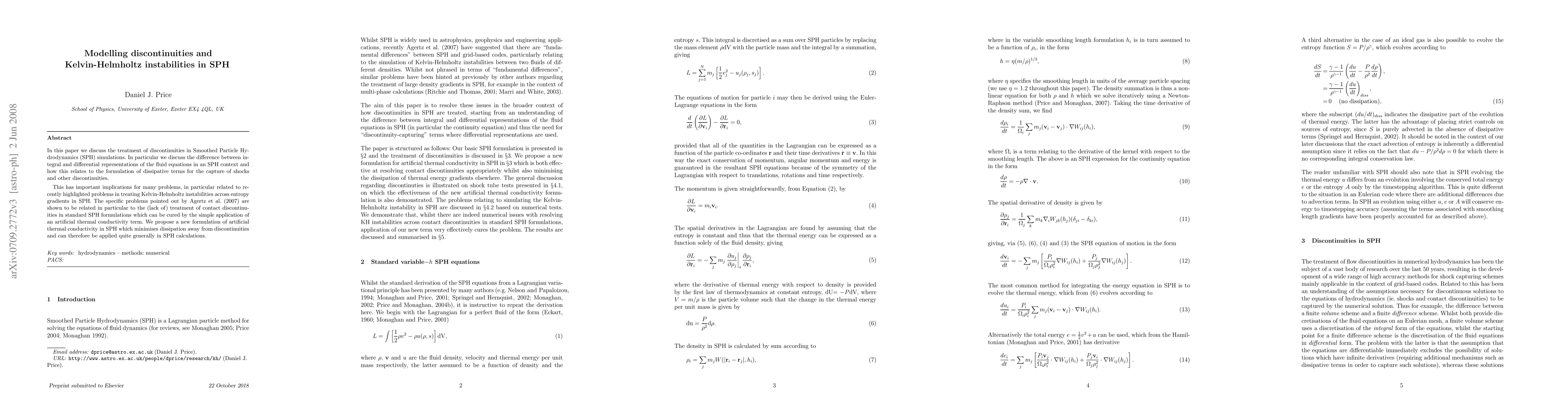 This paper proposes a new method for treating discontinuities in Smoothed Particle Hydrodynamics (SPH) simulations, specifically addressing the Kelvin-Helmholtz instabilities by introducing an artificial thermal conductivity term to better capture shocks and contact discontinuities, thereby minimizing dissipation.