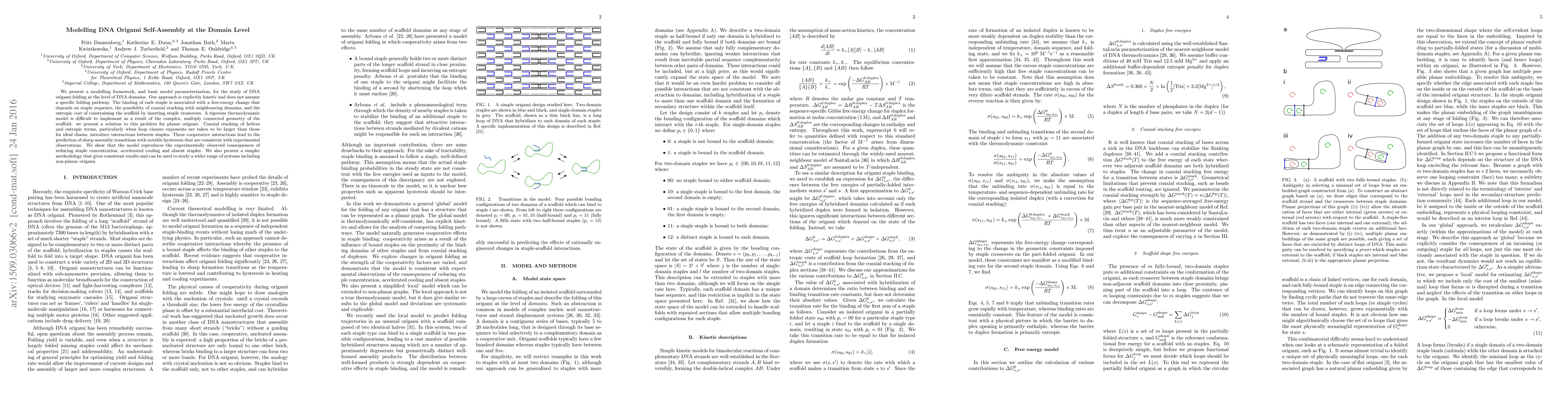We present a modelling framework, and basic model parameterization, for the study of DNA origami folding at the level of DNA domains. Our approach is explicitly kinetic and does not assume a specific folding pathway. The binding of each staple is associated with a free-energy change that depends on staple sequence, the possibility of coaxial stacking with neighbouring domains, and the entropic cost of constraining the scaffold by inserting staple crossovers. A rigorous thermodynamic model is difficult to implement as a result of the complex, multiply connected geometry of the scaffold: we present a solution to this problem for planar origami. Coaxial stacking and entropic terms, particularly when loop closure exponents are taken to be larger than those for ideal chains, introduce interactions between staples. These cooperative interactions lead to the prediction of sharp assembly transitions with notable hysteresis that are consistent with experimental observations. We show that the model reproduces the experimentally observed consequences of reducing staple concentration, accelerated cooling and absent staples. We also present a simpler methodology that gives consistent results and can be used to study a wider range of systems including non-planar origami.