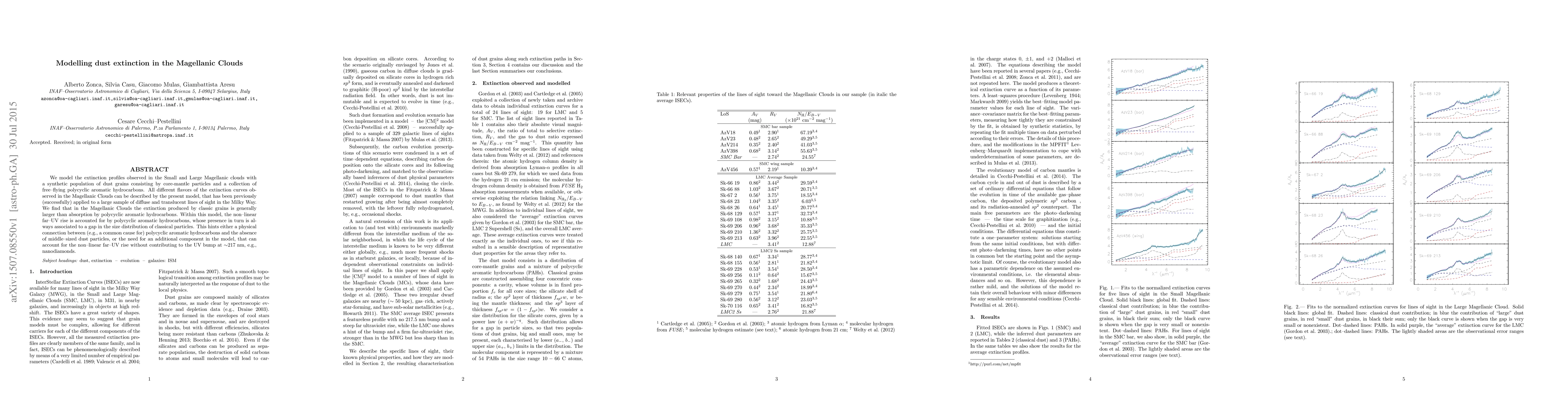 We model the extinction profiles observed in the Small and Large Magellanic clouds with a synthetic population of dust grains consisting by core-mantle particles and a collection of free-flying polycyclic aromatic hydrocarbons. All different flavors of the extinction curves observed in the Magellanic Clouds can be described by the present model, that has been previously (successfully) applied to a large sample of diffuse and translucent lines of sight in the Milky Way. We find that in the Magellanic Clouds the extinction produced by classic grains is generally larger than absorption by polycyclic aromatic hydrocarbons. Within this model, the non-linear far-UV rise is accounted for by polycyclic aromatic hydrocarbons, whose presence in turn is always associated to a gap in the size distribution of classical particles. This hints either a physical connection between (e.g., a common cause for) polycyclic aromatic hydrocarbons and the absence of middle-sized dust particles, or the need for an additional component in the model, that can account for the non-linear far-UV rise without contributing to the UV bump at $\sim$217 nm, e.g., nanodiamonds.