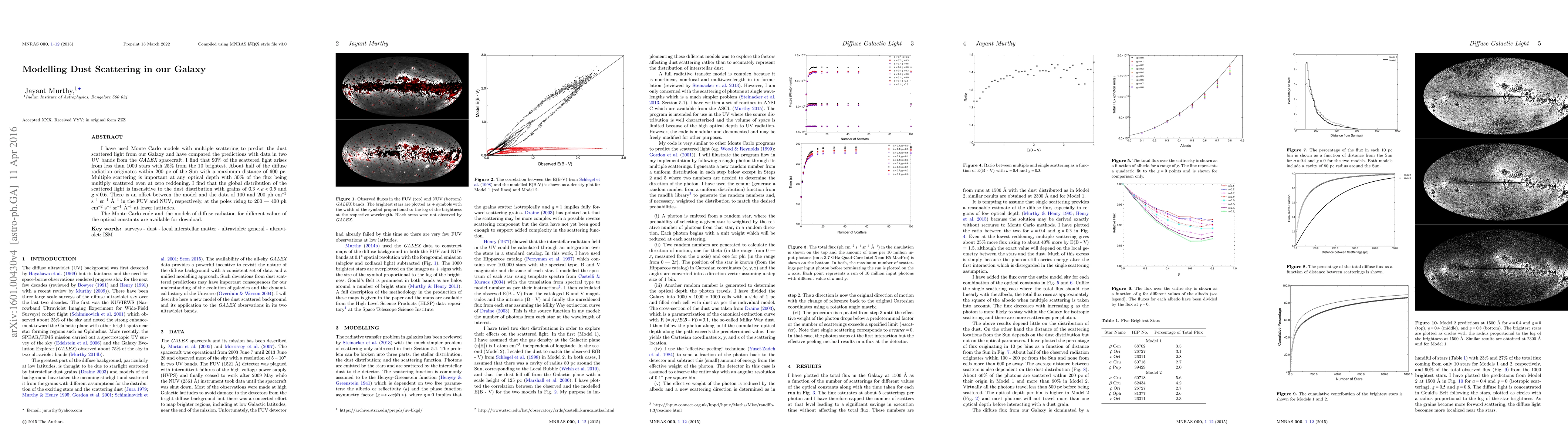 I have used Monte Carlo models with multiple scattering to predict the dust scattered light from our Galaxy and have compared the predictions with data in two UV bands from the GALEX spacecraft. I find that 90\% of the scattered light arises from less than 1000 stars with 25\% from the 10 brightest. About half of the diffuse radiation originates within 200 pc of the Sun with a maximum distance of 600 pc. Multiple scattering is important at any optical depth with 30\% of the flux being multiply scattered even at zero reddening. I find that the global distribution of the scattered light is insensitive to the dust distribution with grains of $0.3 < a < 0.5$ and $g < 0.6$. There is an offset between the model and the data of 100 and 200 ph cm$^{-2}$ s$^{-1}$ sr$^{-1}$ \AA$^{-1}$ in the FUV and NUV, respectively, at the poles rising to 200 --- 400 ph cm$^{-2}$ s$^{-1}$ sr$^{-1}$ \AA$^{-1}$ at lower latitudes. The Monte Carlo code and the models of diffuse radiation for different values of the optical constants are available for download.