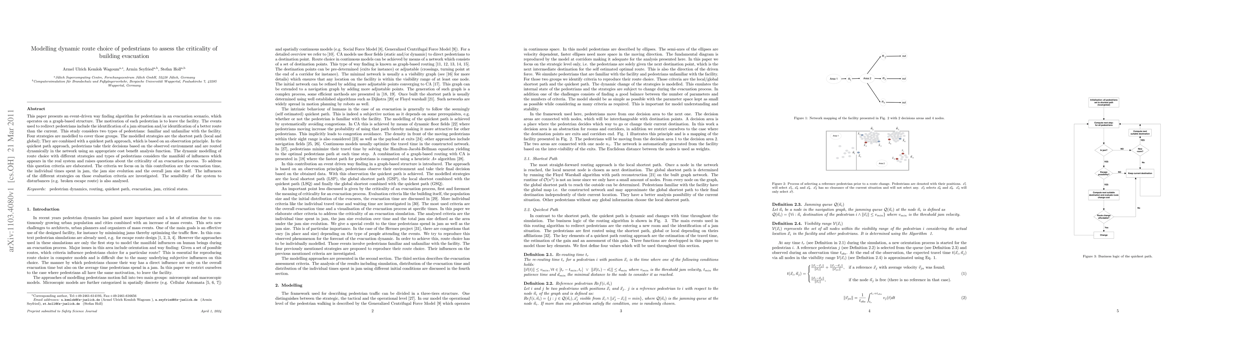 This paper presents an event-driven way finding algorithm for pedestrians in an evacuation scenario, which operates on a graph-based structure. The motivation of each pedestrian is to leave the facility. The events used to redirect pedestrians include the identification of a jam situation and/or identification of a better route than the current. This study considers two types of pedestrians: familiar and unfamiliar with the facility. Four strategies are modelled to cover those groups. The modelled strategies are the shortest path (local and global); They are combined with a quickest path approach, which is based on an observation principle. In the quickest path approach, pedestrians take their decisions based on the observed environment and are routed dynamically in the network using an appropriate cost benefit analysis function. The dynamic modelling of route choice with different strategies and types of pedestrians considers the manifold of in uences which appears in the real system and raises questions about the criticality of an evacuation process. To address this question criteria are elaborated. The criteria we focus on in this contribution are the evacuation time, the individual times spent in jam, the jam size evolution and the overall jam size itself. The in uences of the different strategies on those evaluation criteria are investigated. The sensibility of the system to disturbances (e.g. broken escape route) is also analysed. Keywords: pedestrian dynamics, routing, quickest path, evacuation, jam, critical state