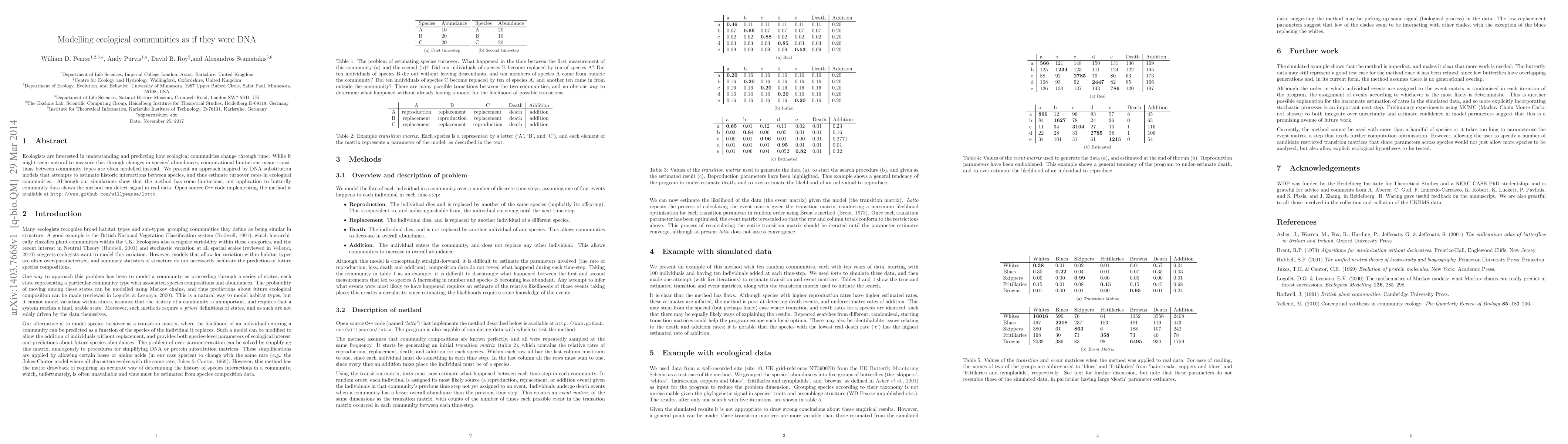 Ecologists are interested in understanding and predicting how ecological communities change through time. While it might seem natural to measure this through changes in species' abundances, computational limitations mean transitions between community types are often modelled instead. We present an approach inspired by DNA substitution models that attempts to estimate historic interactions between species, and thus estimate turnover rates in ecological communities. Although our simulations show that the method has some limitations, our application to butterfly community data shows the method can detect signal in real data. Open source C++ code implementing the method is available at http://www.github.com/willpearse/lotto.