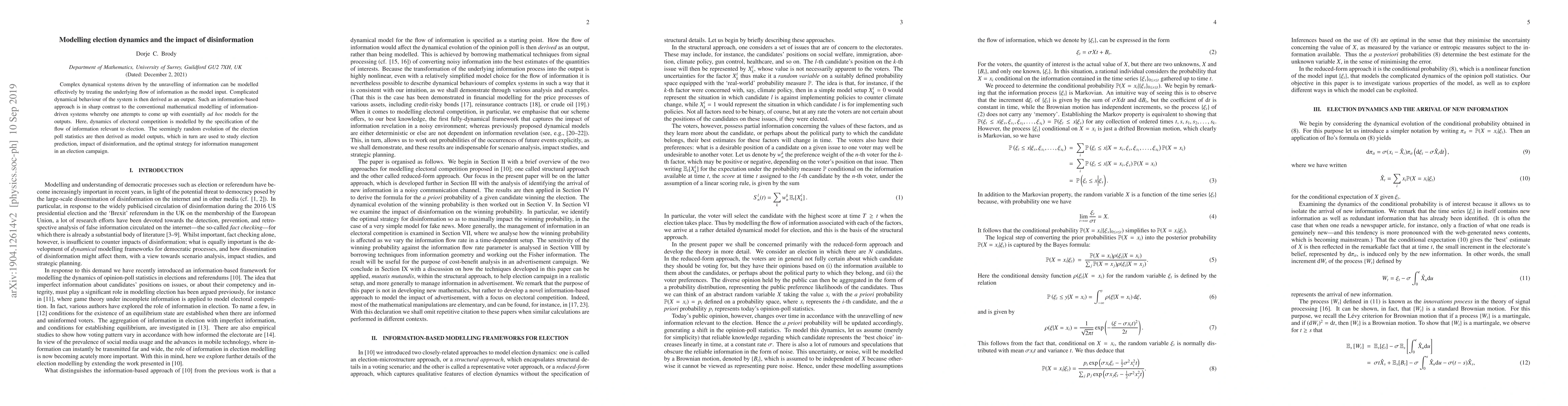 Complex dynamical systems driven by the unravelling of information can be modelled effectively by treating the underlying flow of information as the model input. Complicated dynamical behaviour of the system is then derived as an output. Such an information-based approach is in sharp contrast to the conventional mathematical modelling of information-driven systems whereby one attempts to come up with essentially {\it ad hoc} models for the outputs. Here, dynamics of electoral competition is modelled by the specification of the flow of information relevant to election. The seemingly random evolution of the election poll statistics are then derived as model outputs, which in turn are used to study election prediction, impact of disinformation, and the optimal strategy for information management in an election campaign.