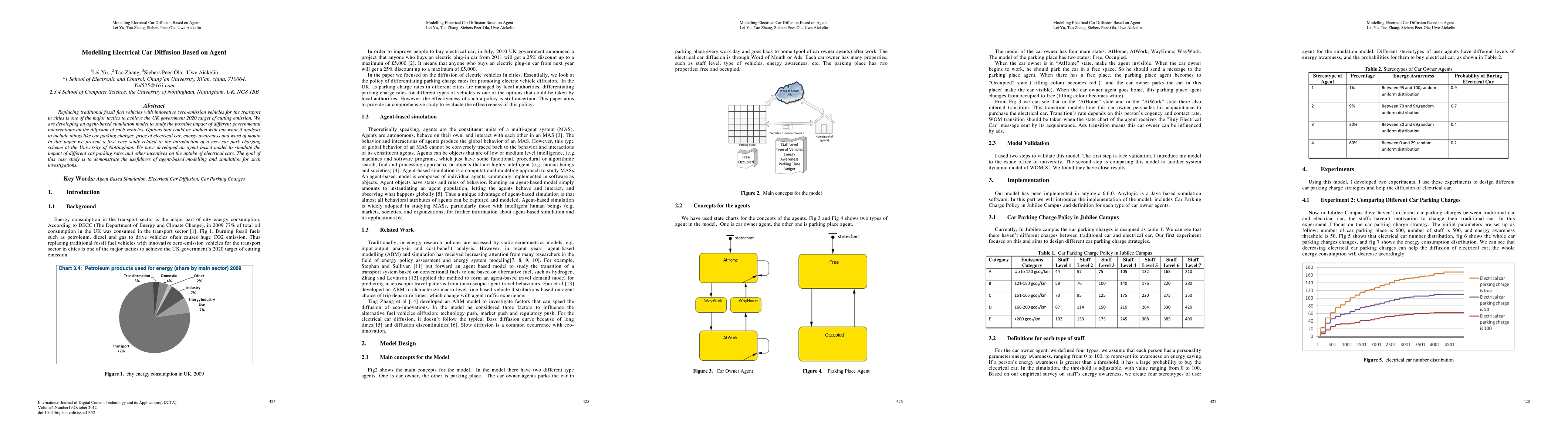 Replacing traditional fossil fuel vehicles with innovative zero-emission vehicles for the transport in ci ties is one of the major tactics to achieve the UK government 2020 target of cutting emission. We are developing an agent-based simulation model to study the possible impact of different governmental interventions on the diffusion of such vehicles. Options that could be studied with our what-if analysis to include things like car parking charges, price of electrical car, energy awareness and word of mouth. In this paper we present a first case study related to the introduction of a new car park charging scheme at the University of Nottingham. We have developed an agent based model to simulate theimpact of different car parking rates and other incentives on the uptake of electrical cars. The goal of this case study is to demonstrate the usefulness of agent-based modelling and simulation for such investigations.