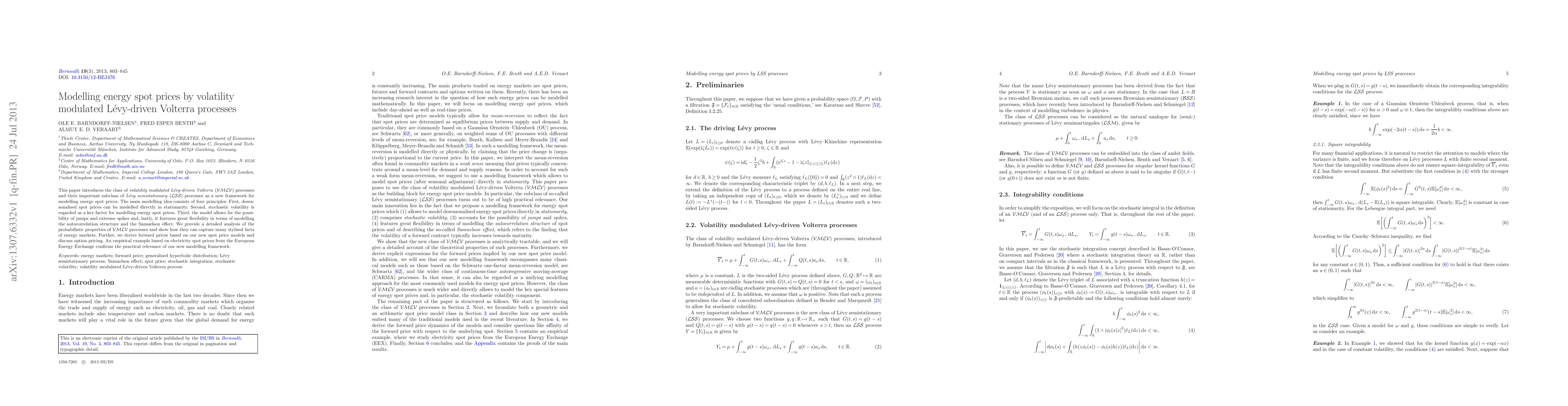 This paper introduces the class of volatility modulated L\'{e}vy-driven Volterra (VMLV) processes and their important subclass of L\'{e}vy semistationary (LSS) processes as a new framework for modelling energy spot prices. The main modelling idea consists of four principles: First, deseasonalised spot prices can be modelled directly in stationarity. Second, stochastic volatility is regarded as a key factor for modelling energy spot prices. Third, the model allows for the possibility of jumps and extreme spikes and, lastly, it features great flexibility in terms of modelling the autocorrelation structure and the Samuelson effect. We provide a detailed analysis of the probabilistic properties of VMLV processes and show how they can capture many stylised facts of energy markets. Further, we derive forward prices based on our new spot price models and discuss option pricing. An empirical example based on electricity spot prices from the European Energy Exchange confirms the practical relevance of our new modelling framework.